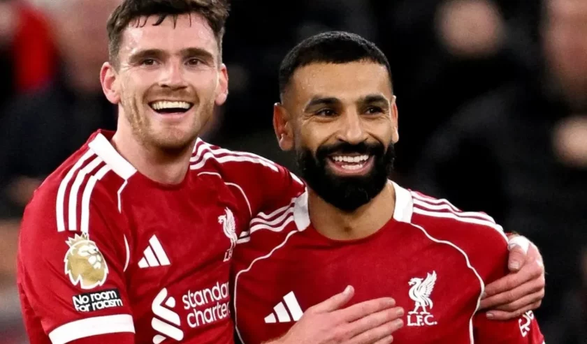 Mohamed Salah, penyerang Liverpool (kanan) merayakan keberhasilannya mencetak gol ke gawang Fulham pada pertandingan Liga Inggris di Stadion Anfield, Liverpool, Sabtu (11/4/2026) waktu setempat. Foto: premierleague.com