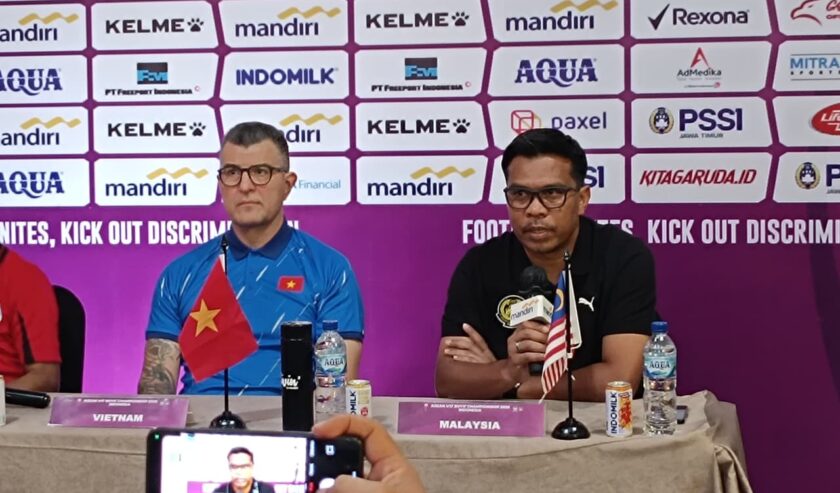 Muhammad Shukor bin Adan (kanan) pelatih tim nasional Malaysia U-17 dalam pre-match press conference Piala AFF U-17 2026 di Surabaya, Sabtu (11/4/2026). Foto: Risky suarasurabaya.net