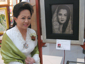 2. PENY SUTRISNO Ketua Panitia Pameran Lukisan Srikandi Nusantara di sebelah lukisan karyanya.
