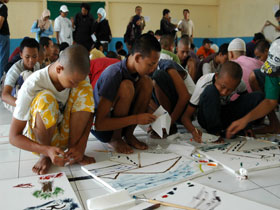 30 narapidana anak-anak, Rabu (01/08) siang itu, memenuhi aula Rutan Medaeng. Dengan tekun mereka mendengarkan uraian Cak KANDAR tentang melukis. Tak perlu panjang lebar Cak KANDAR memberikan arahan dan ilmunya, karena kemudian anak-anak itu diberi kesempatan untuk melukis sesuai dengan apa yang mereka inginkan.