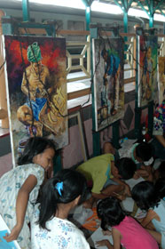 Pada kesempatan pamerannya di tengah hiruk pikuk stasiun kereta api Pasar Turi, MOELYONO mengundang anak-anak jalanan, serta pengamen dan anak-anak kampung sekitar stasiun Pasar Turi untuk kegiatan melukis dan menggambar bersama.(tok)