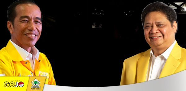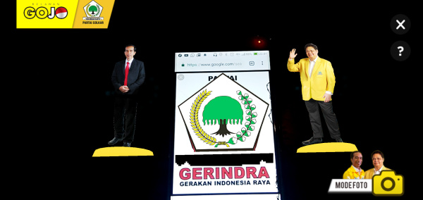 Begitu kamera berhasil memindai lambang parpol, di layar telepon pintar itu akan muncul citra tiga dimensi lambang Partai Golkar, kemudian lambat laun muncul foto Jokowi dan Airlangga Hartarto di kiri-kanan logo partai Golkar itu.