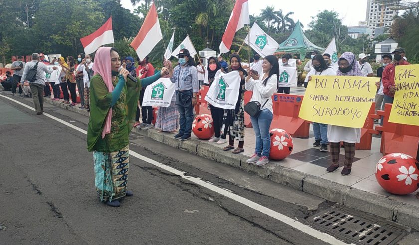 Puluhan orang yang mengatasnamakan Emak-emak Surabaya menggelar aksi ‘Bela Bu Risma’ di depan Balai Kota Surabaya, Jumat (27/11/2020).