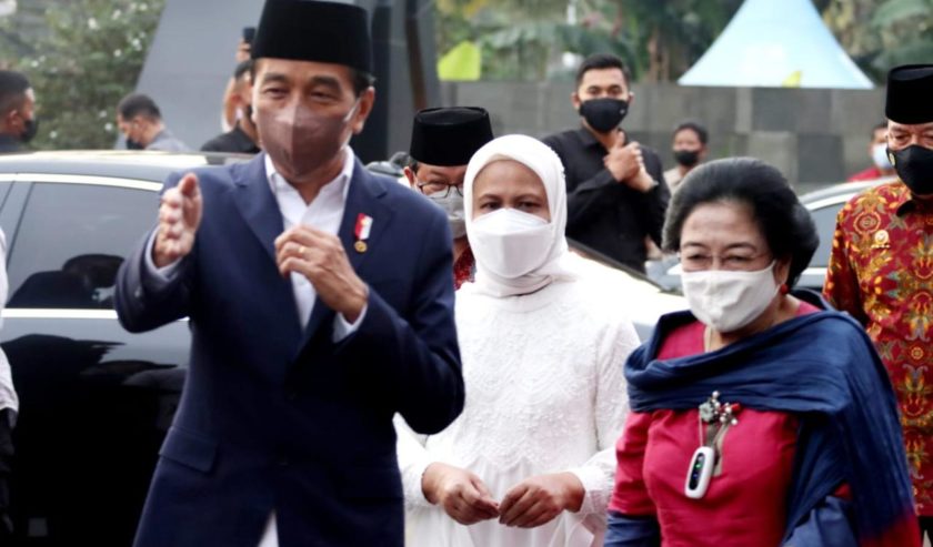 Megawati bicara di samping Jokowi dan Iriana Joko Widodo Ibu Negara usai peresmian Mesjid At Taufiq di Jalan Lenteng Agung, Jakarta Selatan, Rabu (8/6/2022). Sekjen DPP PDIP juga ikut mendampingi Megawati.