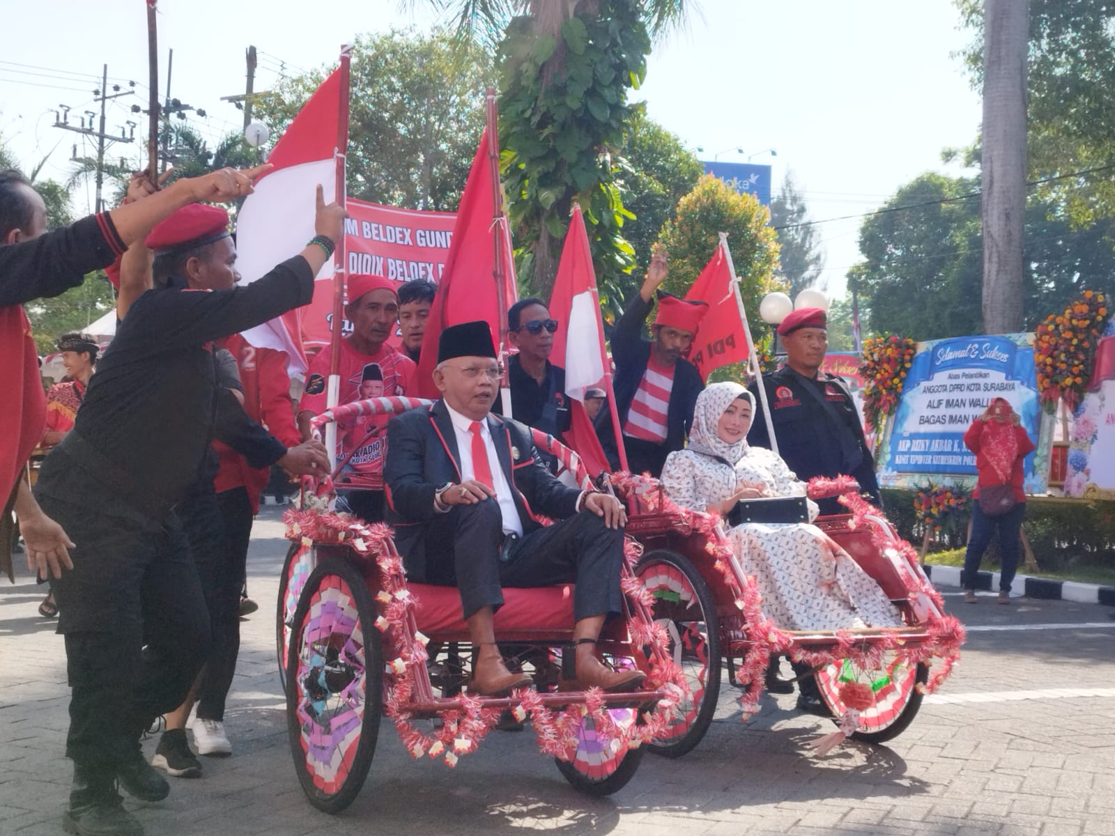Tri Didik Beldex anggota terpilih, hadir bersama istri dengan menaiki becak yang dihias serba merah. Sementara Budi Leksono, hadir bersama keluarga dengan menaiki mobil kuno dan diiringi arak-arakan motor.