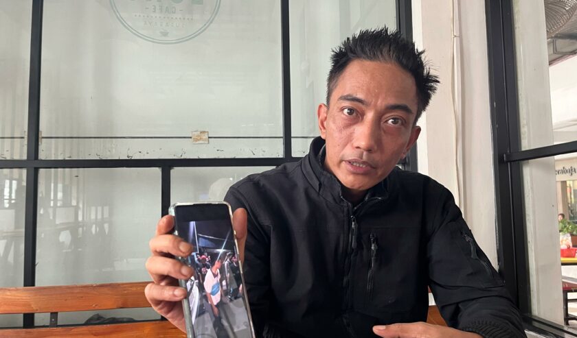 Herdian Ketua KIPP Jawa Timur menunjukkan bukti video temuan pelaku bagi sembako sebelum pemungutan suara, Senin (2/12/2024). Foto: Meilita Elaine suarasurabaya.net