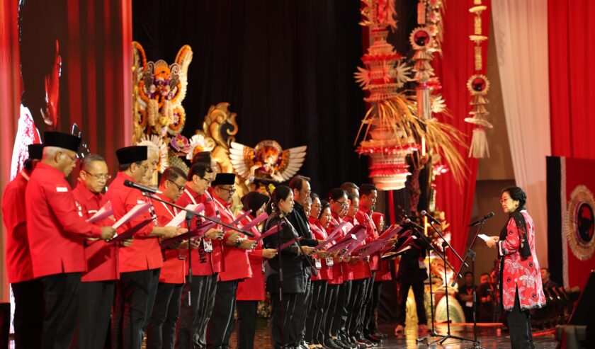 Setelah itu, seluruh pengurus DPP yang hadir berdiri di panggung utama, dan dengan dipandu langsung oleh Megawati, mereka mengucapkan sumpah jabatan secara bersama-sama.