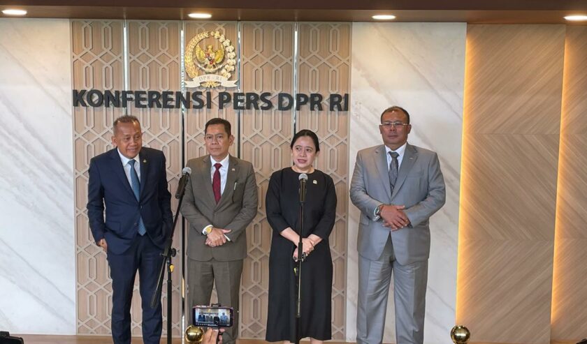 Puan Maharani Ketua DPR RI didampingi tiga wakil ketua DPR dalam konferensi pers di gedung Nusantara II, Kompleks Parlemen Senayan Jakarta, Kamis (21/8/2025). Foto: Faiz Fadjarudin suarasurabaya.net