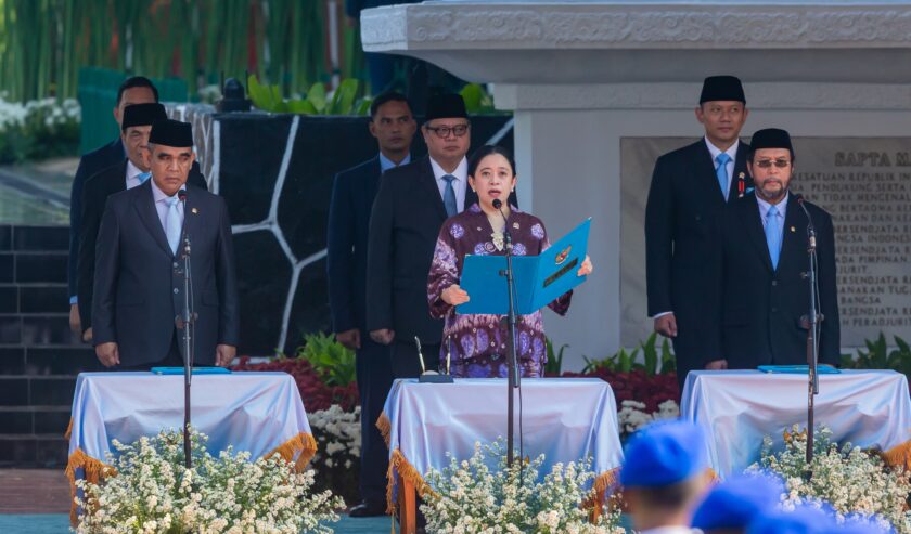 “Dengan rahmat Tuhan Yang Maha Esa, kami yang melakukan upacara ini menyadari sepenuhnya bahwa sejak diproklamasikannya Kemerdekaan Negara Kesatuan Republik Indonesia pada 17 Agustus 1945, telah banyak terjadi rongrongan, baik dari dalam maupun luar negeri,” ucap Puan dalam pembacaan ikrarnya.