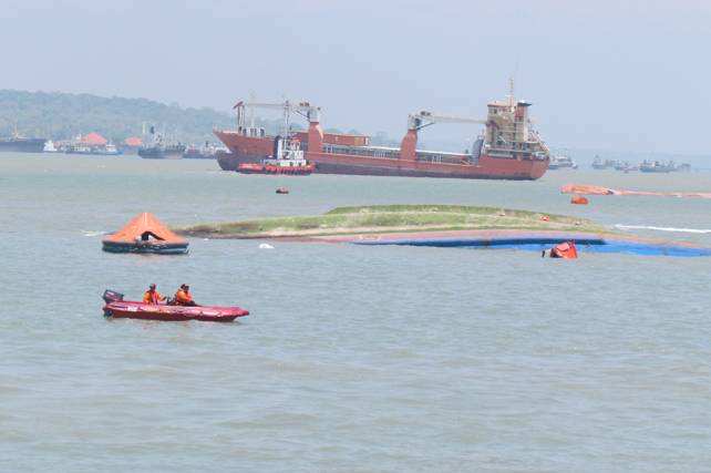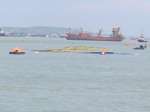 Kapal Motor (KM) Wihan Sejahtera yang berangkat dari Surabaya dengan tujuan Pelabuhan Bajo, Nusa Tenggara Timur tenggelam, Senin (16/11/2015) pagi di dekat Terminal Teluk Lamong. Tampak kapal saat miring dan mulai tenggelam.