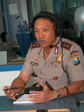 Senin (05/01) pagi Irjen Pol FIRMAN GANI Kapolda Jawa Timur berkenan hadir dan berbincang dalam acara talk show di Suarasurabaya. Beliau mengingantkan keamanan Jawa timur menjelang Pemilu 2004.