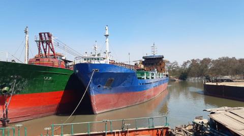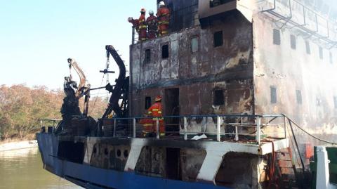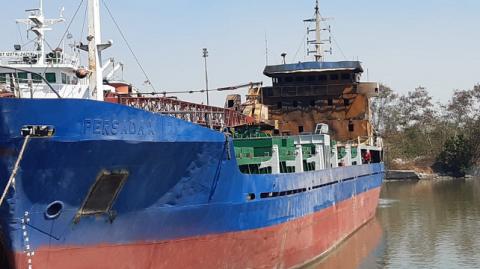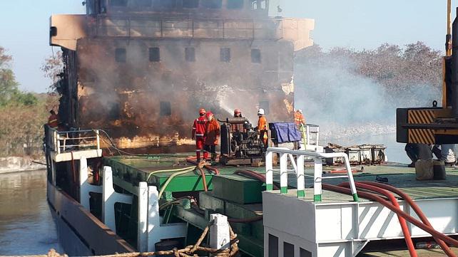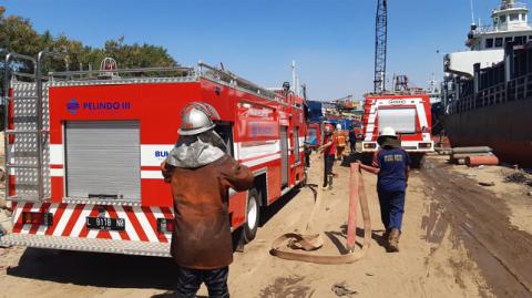 Petugas pemadam kebakaran (PMK) berusaha memadamkan api Kapal Motor (KM) Persada X yang terbakar di Terminal Nilam Barat, Pelabuhan Tanjung Perak, Surabaya, Sabtu (29/6/2019). Diketahui, kapal kargo ini terbakar saat nge-dok di PT Tambangan Raya.