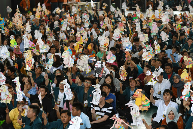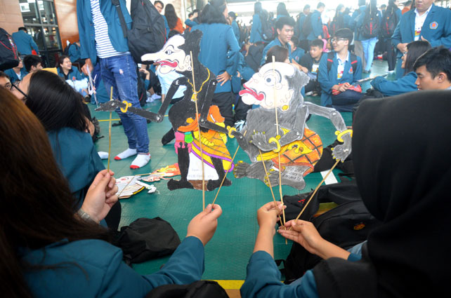 2.400 mahasiswa baru Universitas Surabaya (Ubaya), Jumat (2/8/2019) diajak mengenali dna mencintai keberagaman budaya negeri ini lewat Wayang Kertas. “Para mahasiswa baru yang memang generasi milenial wajib mengenali, lalu menjaga kelestarian keberagaman budaya negeri ini yang sangat besar. Ini penting diketahui,” terang Benny Lianto Rektor Ubaya saat memberikan sambutan. Para mahasiswa baru menghias dan memainkan Wayang Kertas.