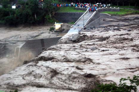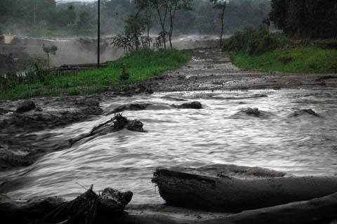 Lahar dingin terjang Kali Konto tepatnya di sekitar Jembatan Pondok Agung, Desa Siman, Kecamatan Kepung, Kediri, Selasa (18/2/2014). Lahar dingin menerjang beberapa desa di kaki Gunung Kelud setelah hujan lebat turun di Puncak Kelud. Saat lahar turun, masyarakat diimbau menjauh dari aliran sungai lahar.