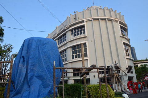 Terhalang bangunan pos Polisi, patung pejuang didekat Siola, saat ini sedang dalam pembangunan kembali, dan posisinya dipindah. “Sebelumnya disamping pos Polisi. Sekarang dipindah di Siola. Bagian dari bangunan depan Siola,” kata Mulyanto pekerja yang ditemui suarasurabaya.net, Senin (22/5/2017).