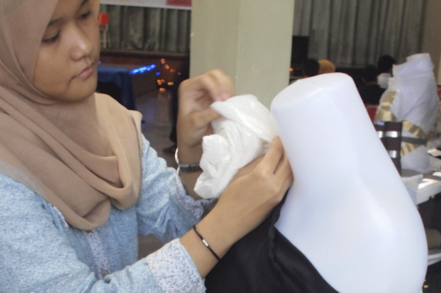 Annisa Nurlaili bersama kelompoknya menampilkan Spellcaster, sebuah rok berbahan plastik bekas bungkus kopi. Dikemas dalam Recycle Fashion, Senin (23/6/2014) di kampus DKV iSTTS.