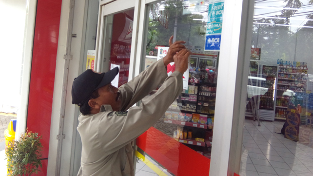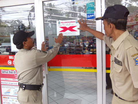 Petugas Satpol-PP Kota Surabaya menempelkan stiker pelanggaran di pintu kaca minimarket di daerah Margorejo.
