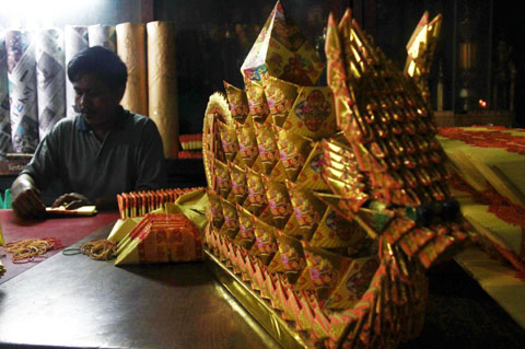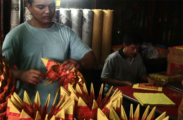 Perlengkapan sembahyang Imlek 2569, seperti Kimchua mulai dipersiapkan. Disejumlah klenteng di Surabaya, Jumat (9/2/2018) menjelang Imlek persiapan terus dilakukan diantaranya adalah mempersiapkan perlengkapan sembahyang. “Kimchua memang bagian perlengkapan sembahyang dan dibutuhkan umat. Apalagi juga menjelang Imlek, pasti banyak masyarakat yang membutuhkan,” kata Leo satu diantara pengurus Klenteng Dukuh.