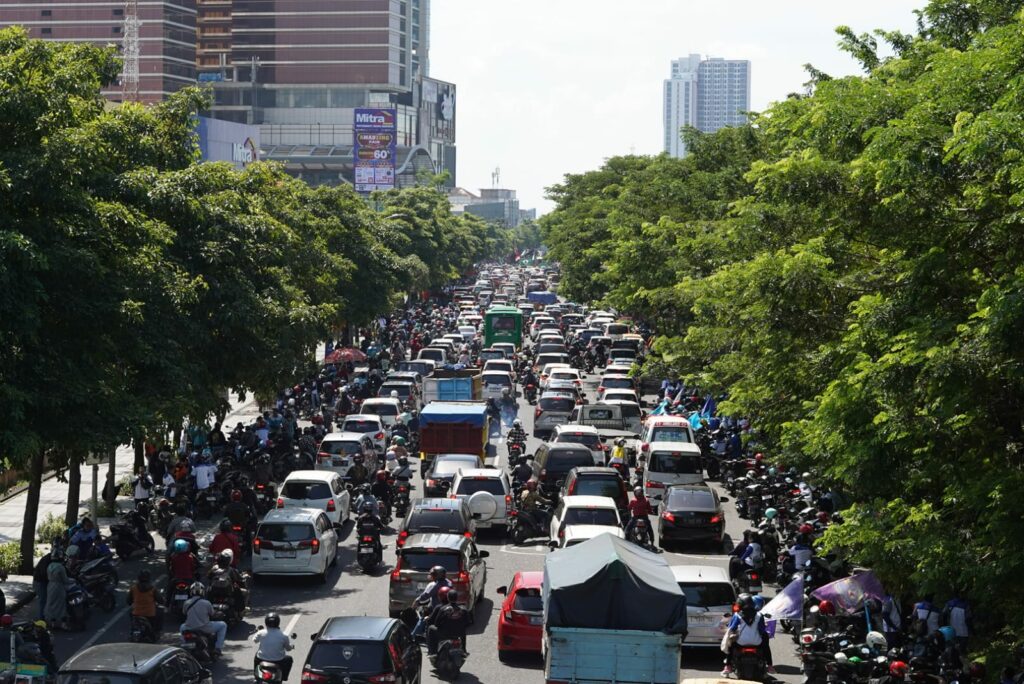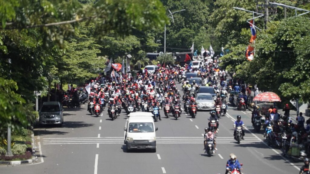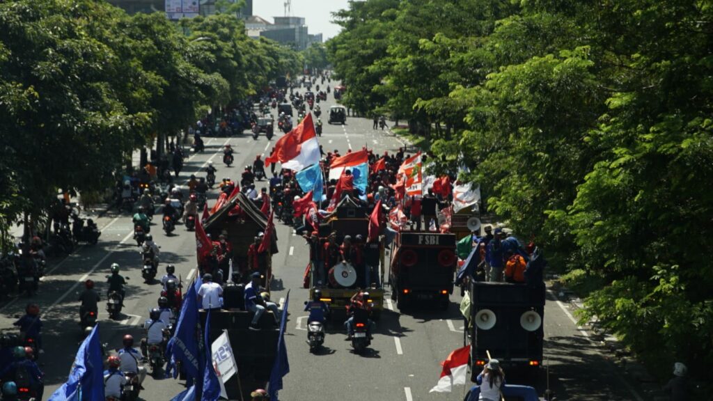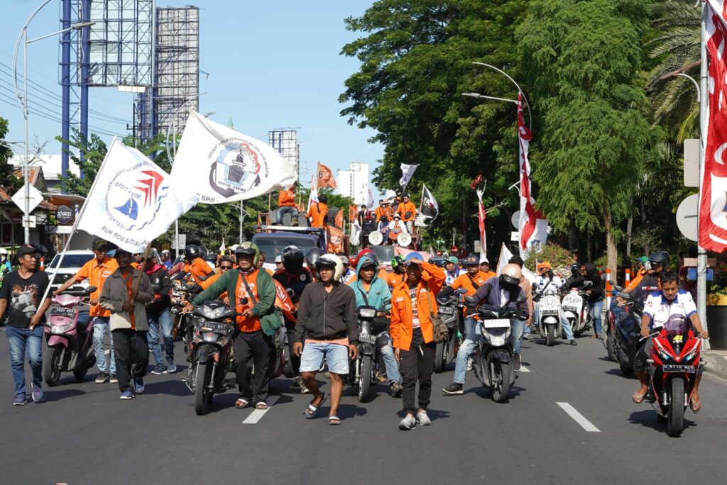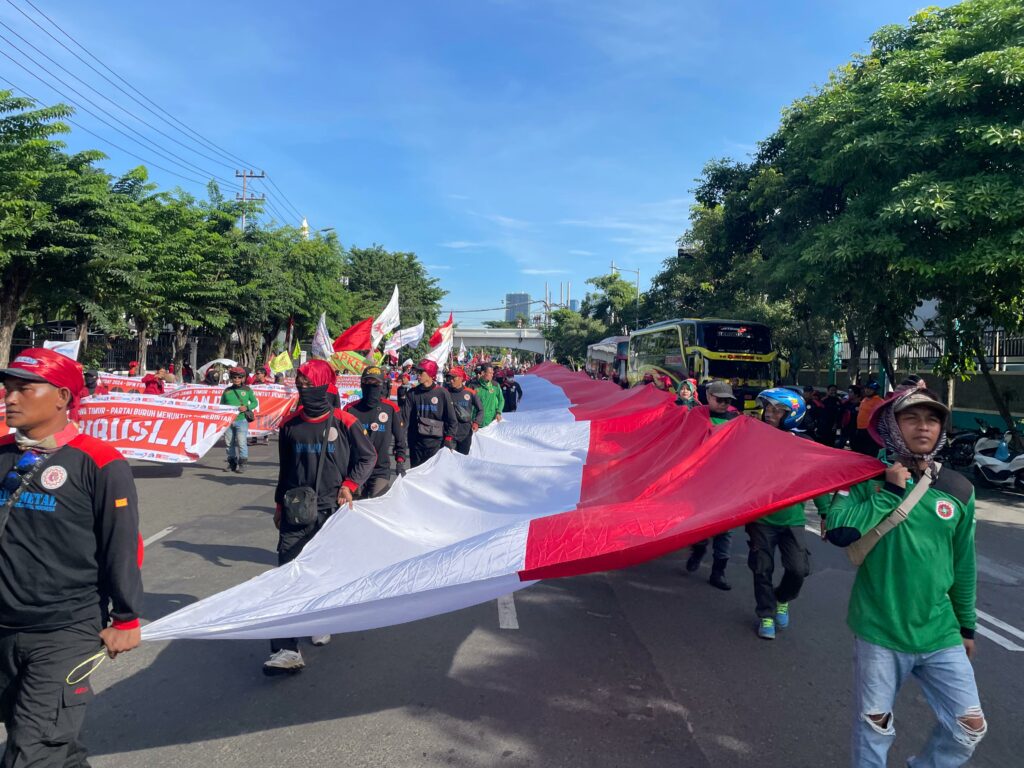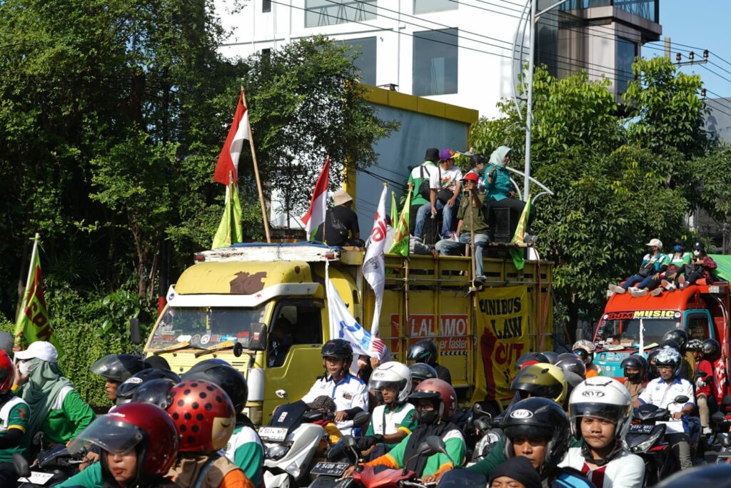 Massa berkumpul di frontage Jalan Ahmad Yani. Selanjutnya, mereka bergerak ke pusat Kota Pahlawan.