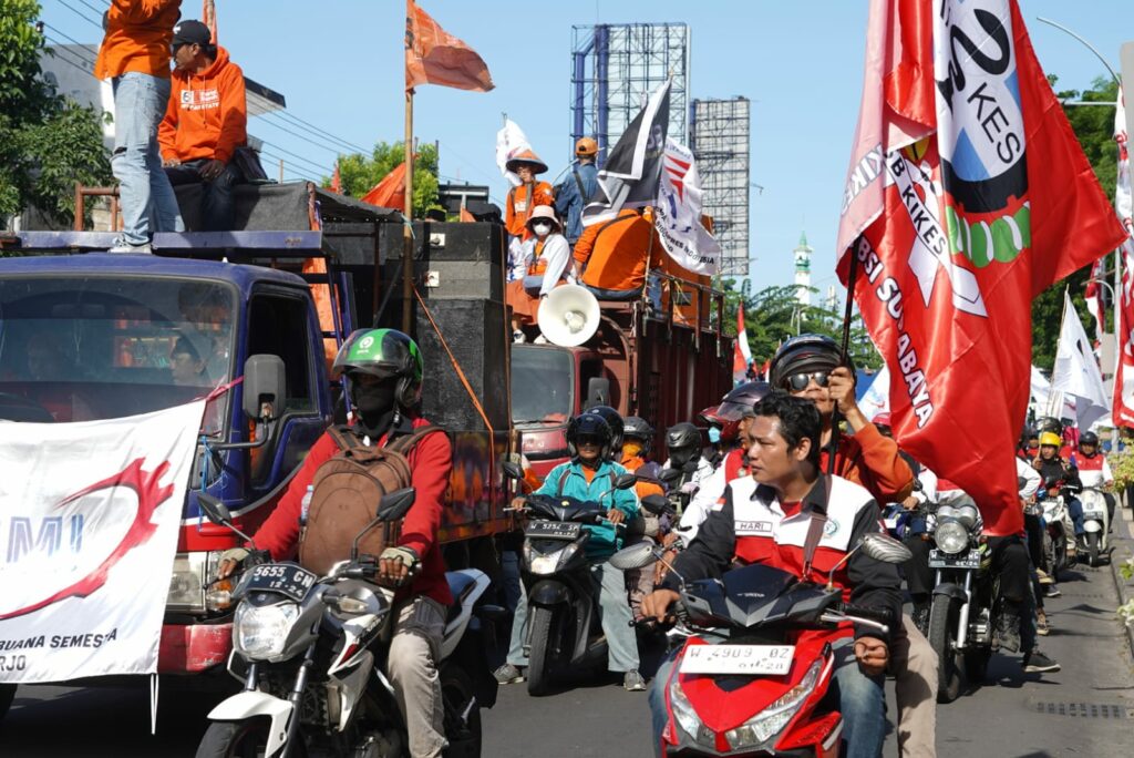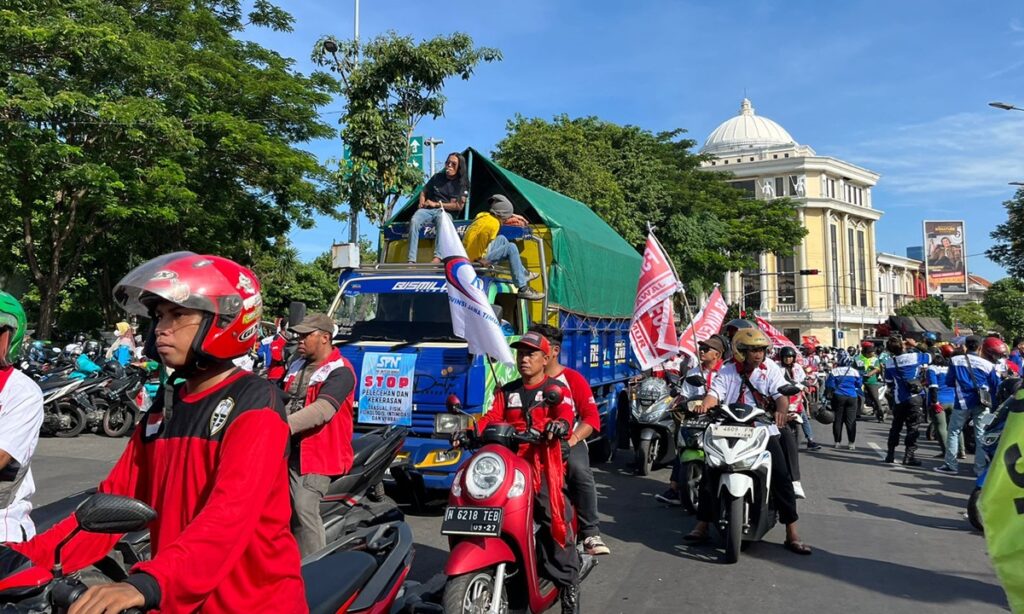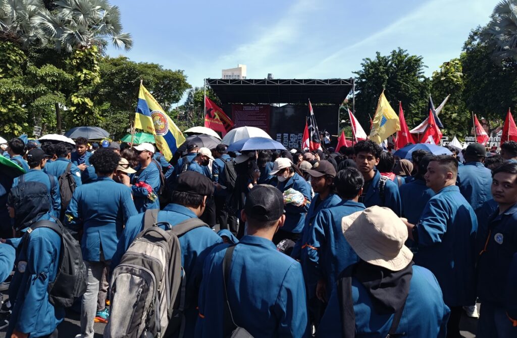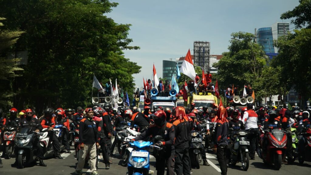 Ribuan massa aksi Hari Buruh datang ke Surabaya pada Rabu (1/5/2024). Mereka datang dari berbagai daerah di Jawa Timur (Jatim).