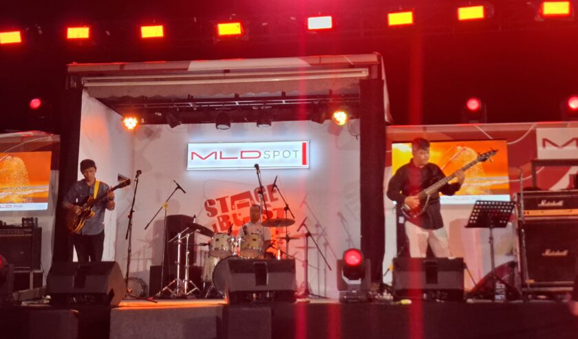 Ayox tampil bersama dua rekannya yang bermain pada bass dan drum.
