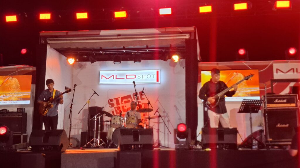 Ayox tampil bersama dua rekannya yang bermain pada bass dan drum.