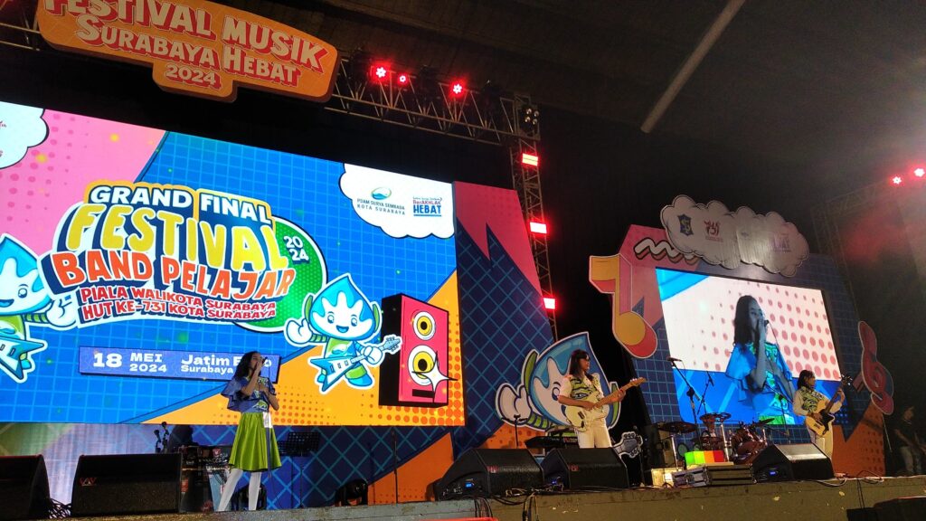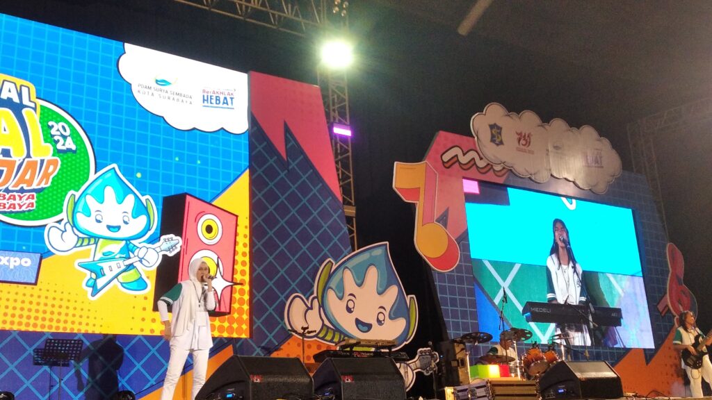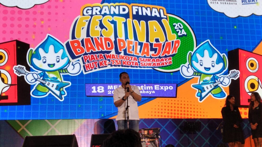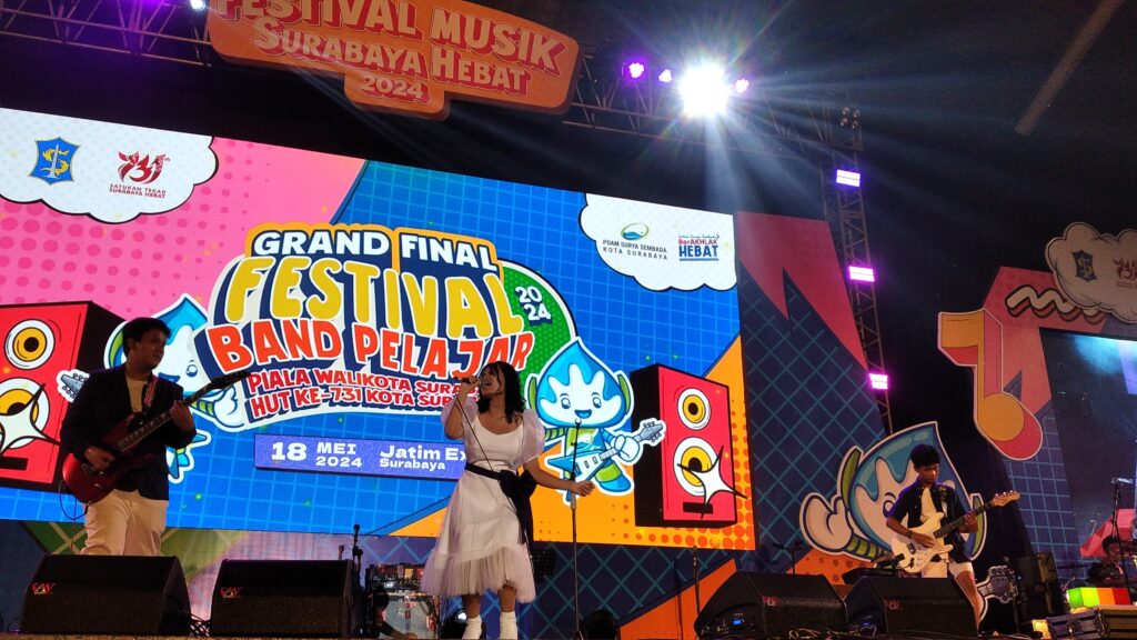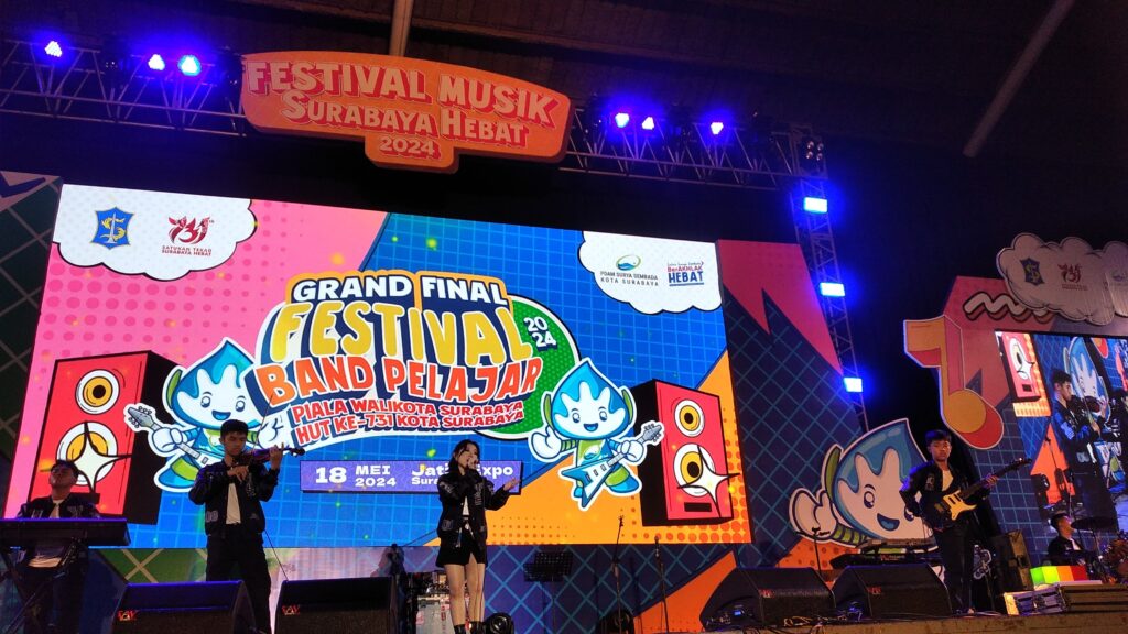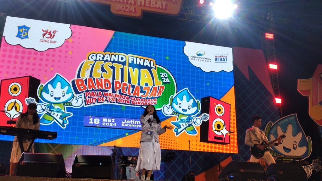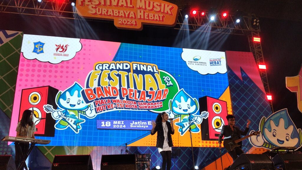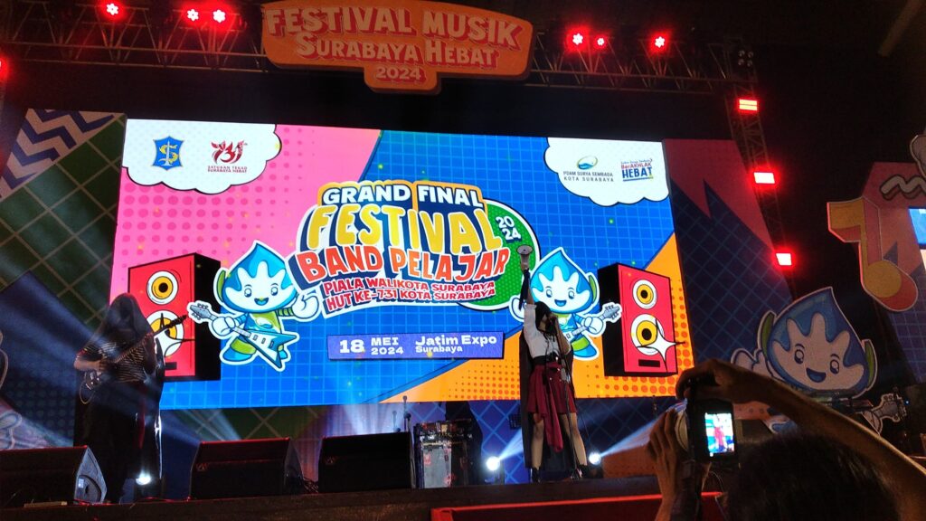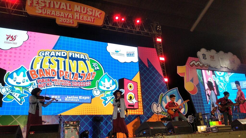 Memperingati Hari Jadi Kota Surabaya (HJKS) ke-731, PDAM Surya Sembada bersama Pemerintah Kota (Pemkot) Surabaya menggelar grand final festival band dalam rangkaian acara Festival Musik Surabaya Hebat 2024, di Jatim International Expo, Sabtu (18/5/2024).