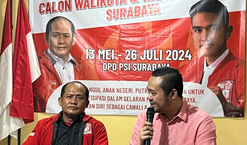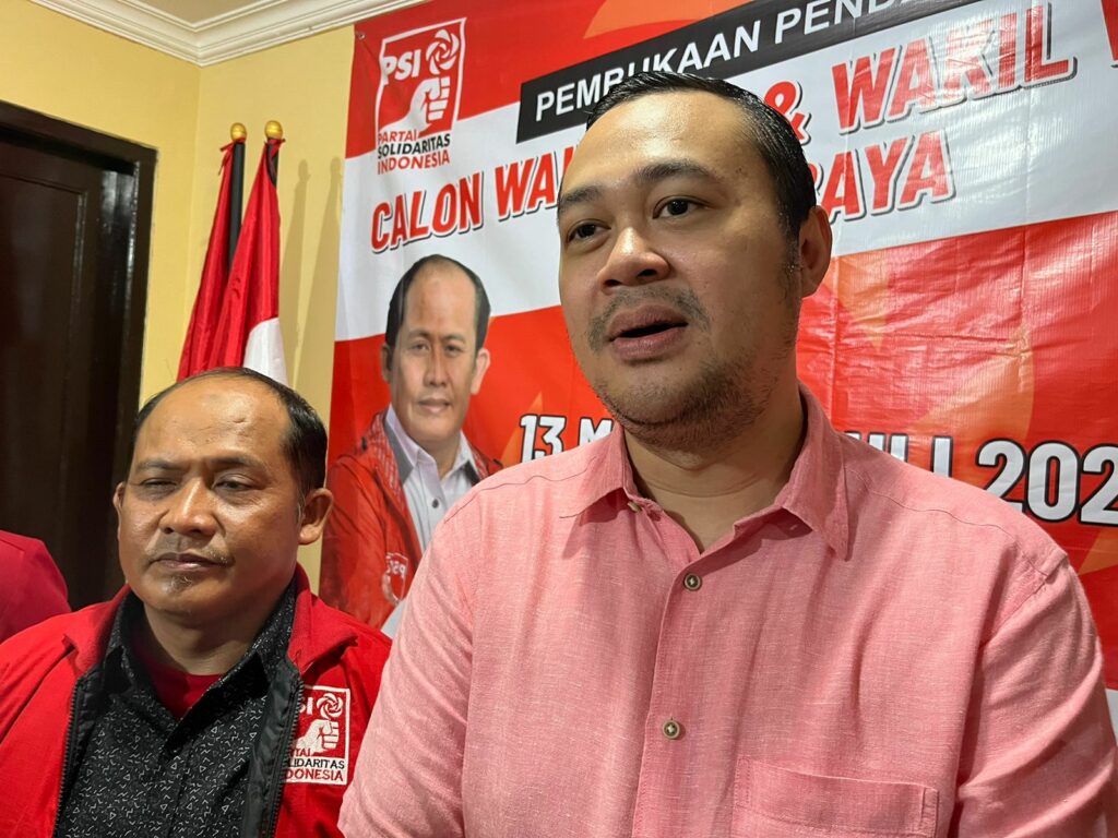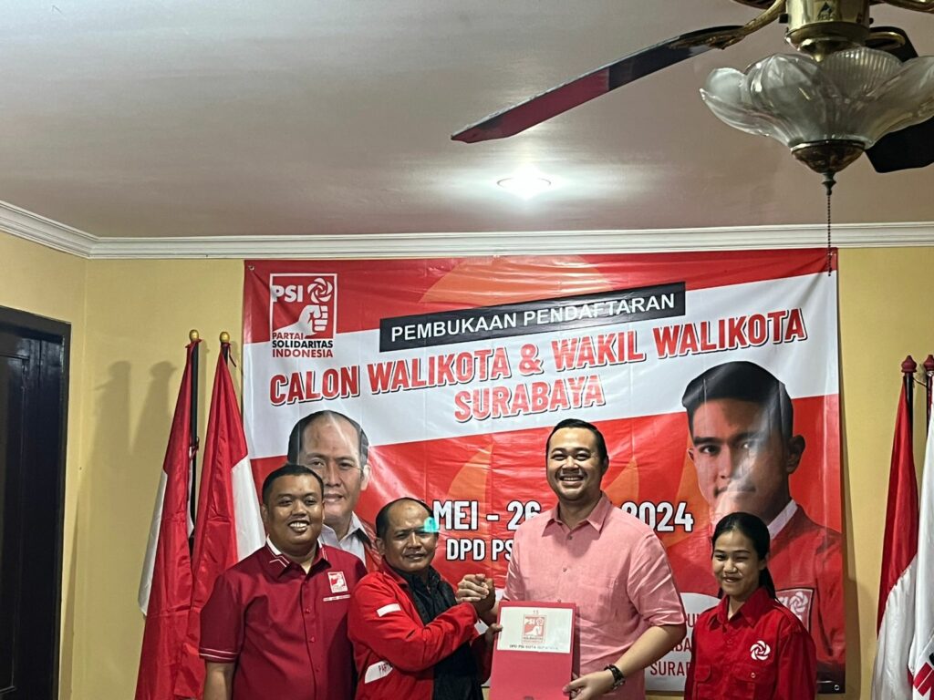 Bayu Airlangga Ketua Pro Jokowi (Projo) resmi mendaftar Pemilihan Wali Kota (Pilwali) Surabaya lewat Dewan Pimpinan Daerah (DPD) Partai Solidaritas Indonesia (PSI) Surabaya, malam ini, Rabu (12/6/2024).
