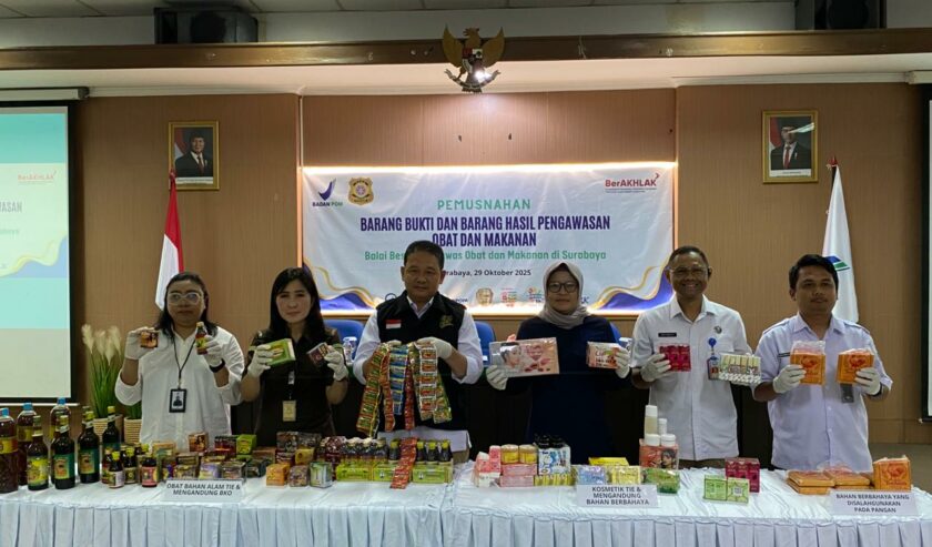 Balai Pengawas Obat dan Makanan (BPOM) Surabaya memusnahkan 888.308 produk obat, makanan dan kosmetik ilegal yang memiliki kandungan berbahaya bagi kesehatan dengan total nilai ekonomi mencapai Rp10,3 miliar.