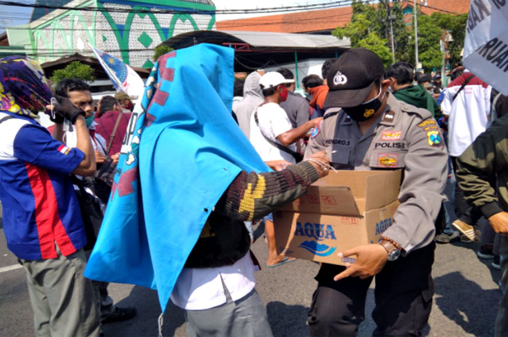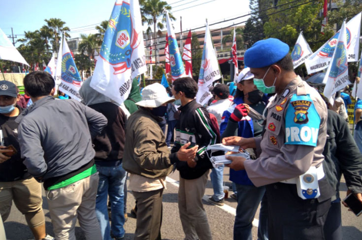 Aksi demo buruh beberapa dari kota Surabaya, Pasuruan dan Gresik serta Sidoarjo, di depan gedung DPRD Jatim menuntut pencabutan Omnibus Law. Dengan penjagaan ketat Polisi yang memmasang barikade kawat berduri serta puluhan Polisi dan Polwan, menjaga semua aktivitas pengunjuk rasa.  Foto: totok suarasurabaya.net