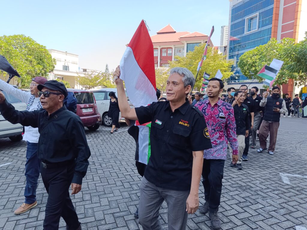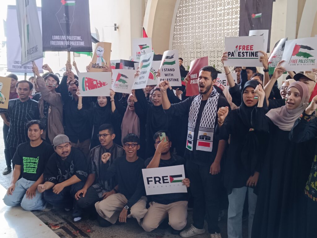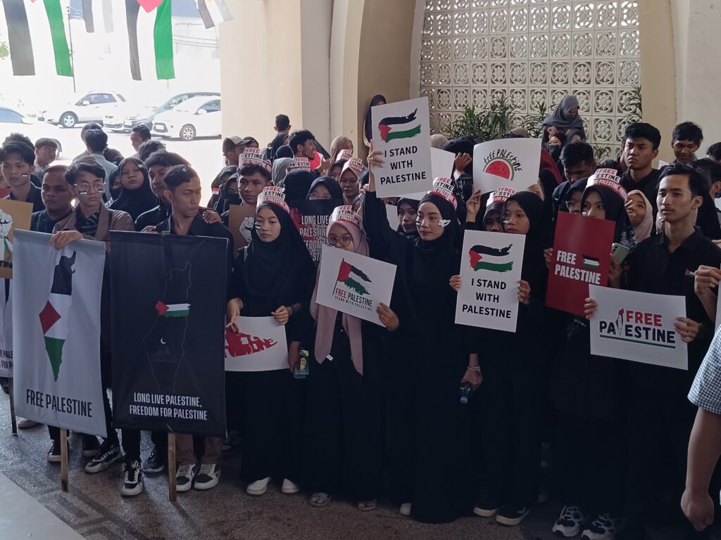 Aksi tersebut diikuti oleh mahasiswa, dosen hingga para pimpinan Universitas. Sebagian besar di antara mereka membawa atribut dukungan seperti poster hingga bendera Palestina.