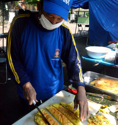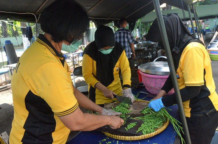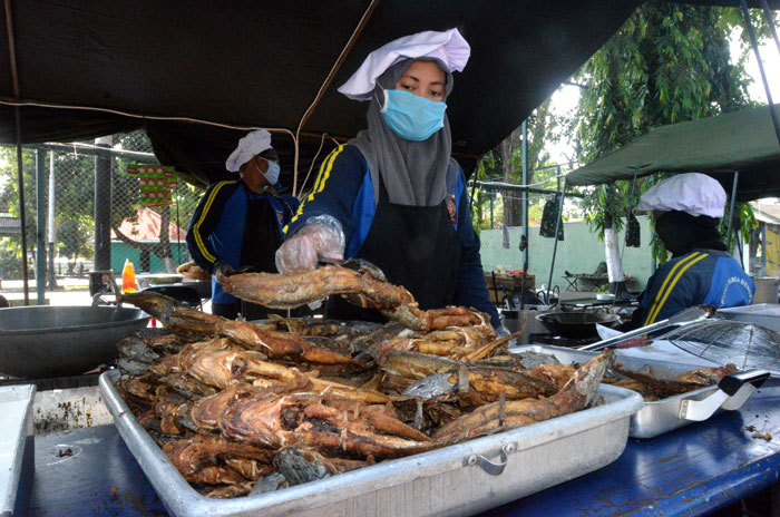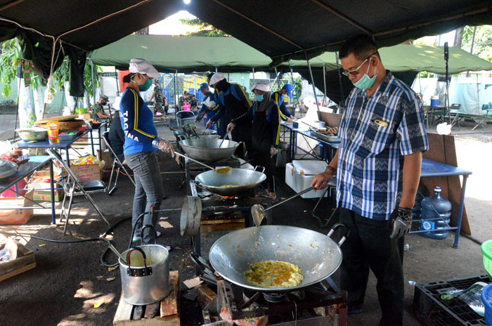 Berada di lapangan tenis Brawijaya di kawasan Jl. Hayam Wuruk, dapur umum dibangun untuk memberikan bantuan makanan kepada warga masyarakat terdampak pandemi Covid-19. Dapur umum ini menyediakan sekurangnya 2.000 nasi bungkus dalam sekali masak. Setiap hari sekurangnya 2 kali masak dilaksanakan di dapur umum yang berada tidak jauh dari Kodam V Brawijaya tersebut. Selasa (5/5/2020) ikan Lele goreng dan Telor dadar ditambah sayuran disiapkan tim dapur umum yang terdiri dari berbagai unsur diantaranya dari prajurit TNI AD Kodam V Brawijaya, Polisi, dan Tagana. Kolonel Zeni Bima Asisten Logistik (Aslog) Kodam V Brawijaya menyampaikan bahwa pemberian bantuan nasi bungkus untuk sahur dan berbuka puasa melibatkan Babinsa pada setiap wilayah. “Supaya bantuan ini memang tepat sasaran,” terang Kolonel Zeni Bima. Anggota Tagana di tenda dapur umum menyiapkan lauk ikan Lele goreng. Foto: Totok suarasurabaya.net