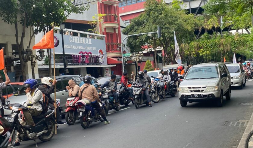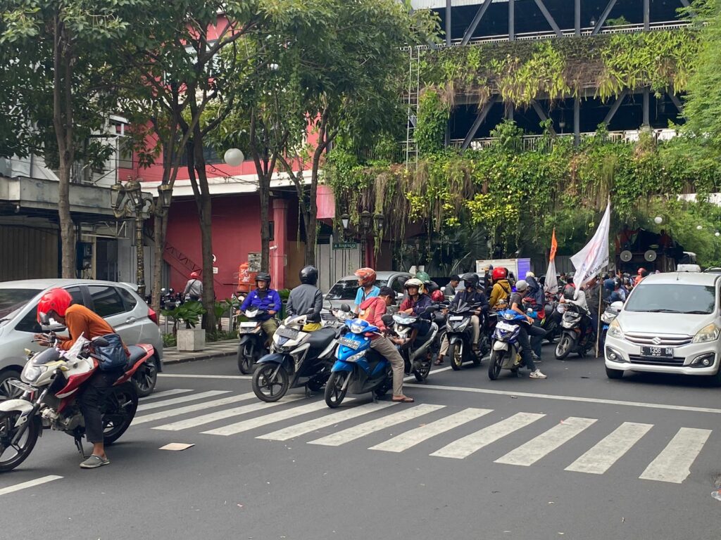 Massa aksi demo buruh dari kelompok Federasi Serikat Pekerja Metal Indonesia (FSMPI) Surabaya menggelar orasi di sejumlah titik lokasi di Kota Surabaya, Kamis (4/1/2024). Bahkan sempat melumpuhkan kawasan Jalan Embong Malang, Surabaya.
