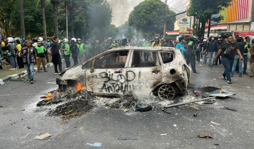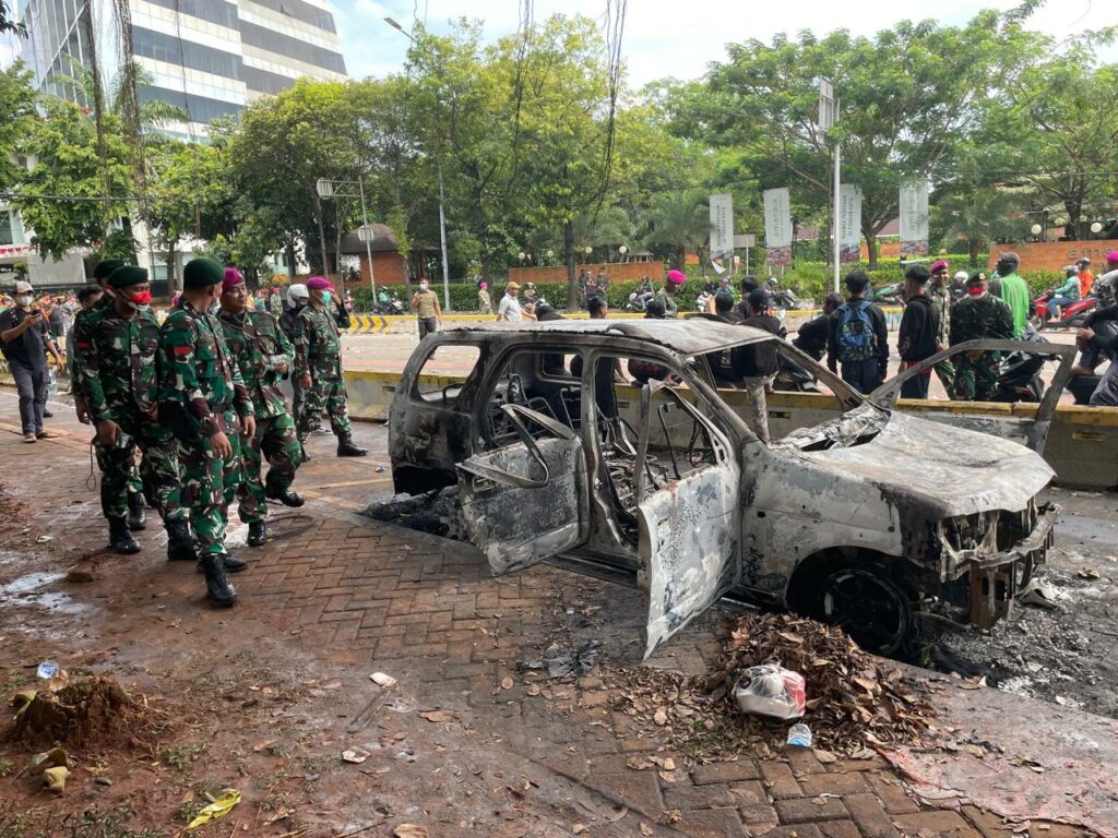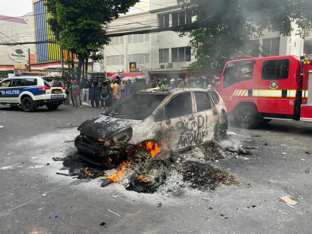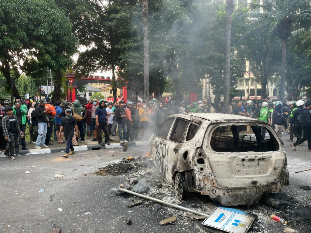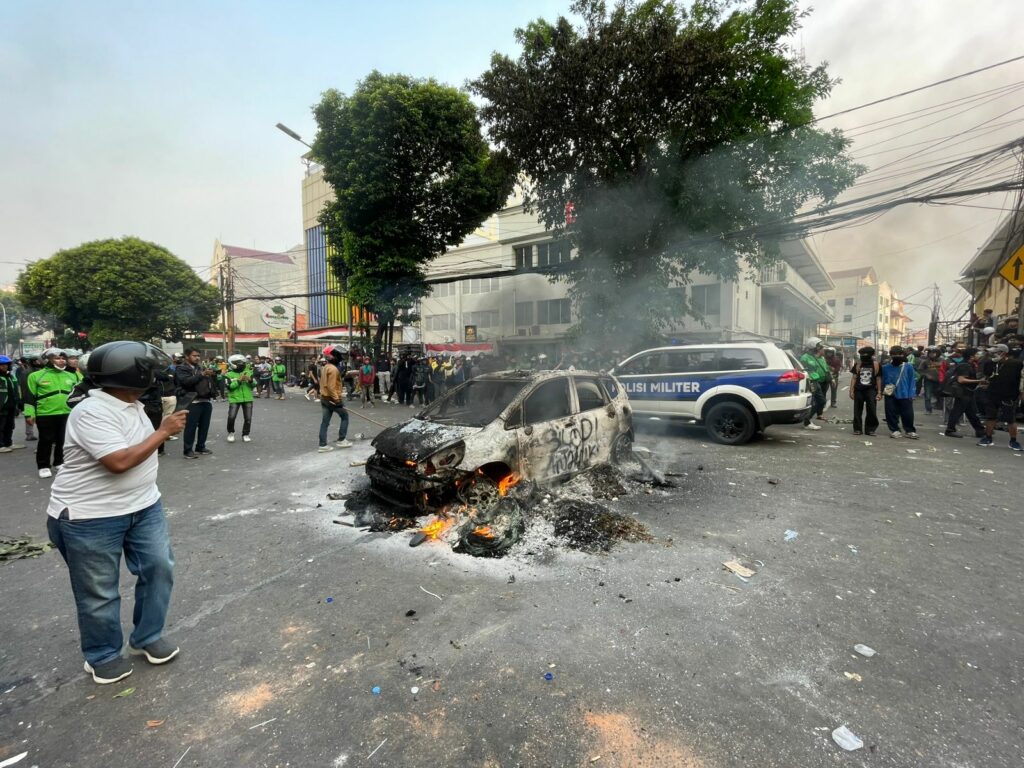 Sempat terjadi pelemparan batu, botol mineral, dan bom molotov di lokasi demo.