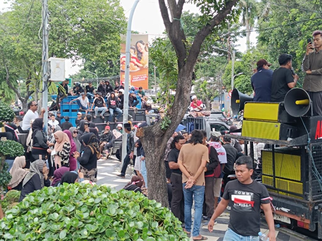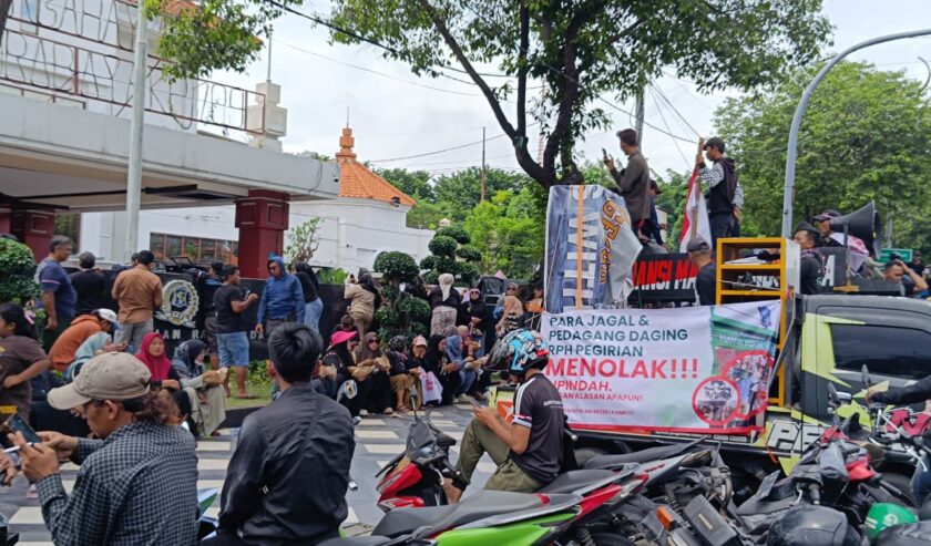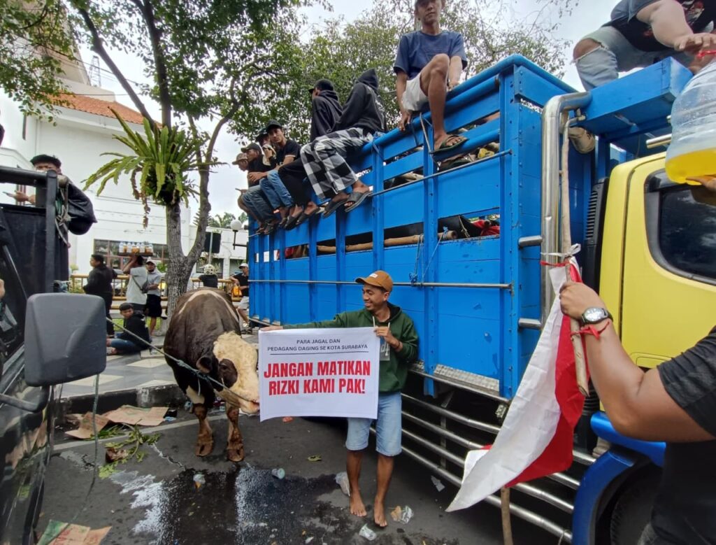 Ratusan jagal sapi dan pedagang daging menggruduk Kantor DPRD Kota Surabaya dalam aksi demonstrasi tolak relokasi rumah potong hewan (RPH), pada Senin (12/1/2026).