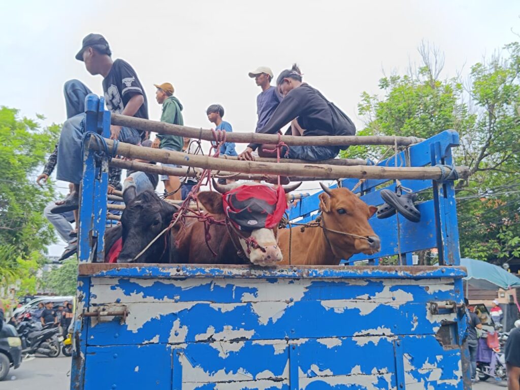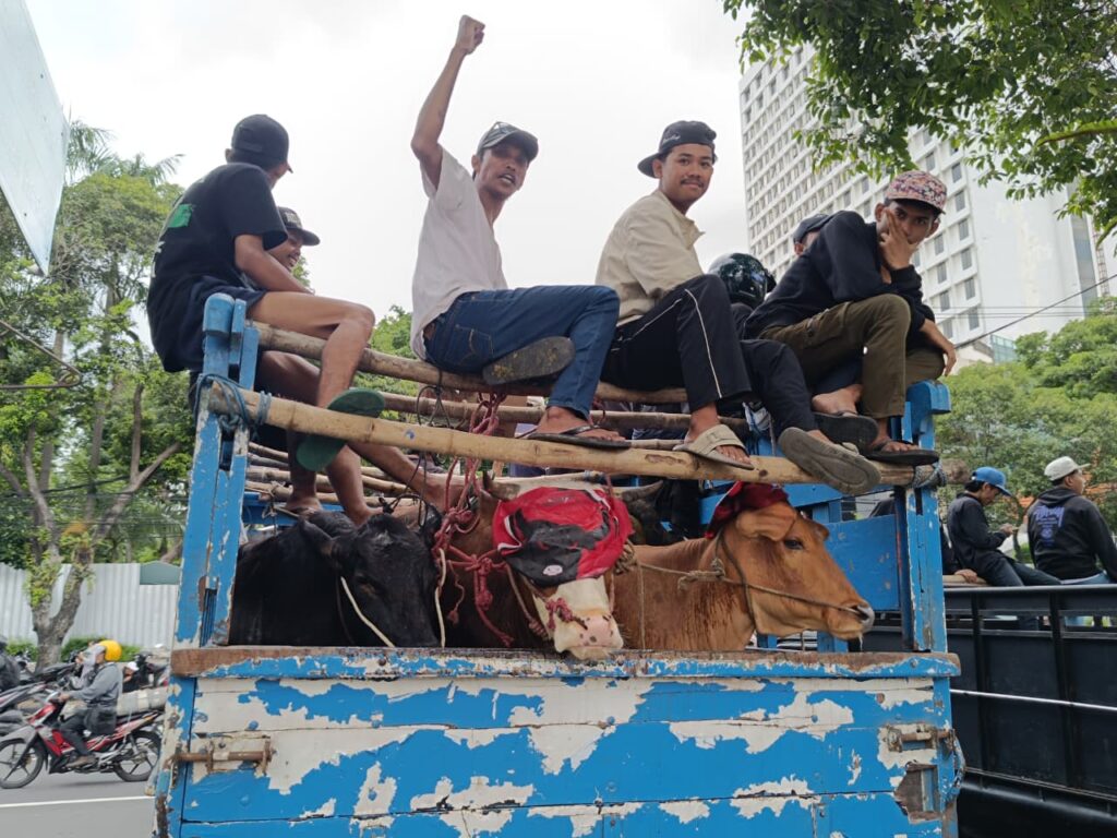 Di antara ratusan demontran tersebut ada yang membawa sapi. Beberapa sapi dinaikkan truk, serta ada juga yang ditali di samping truk dan dibiarkan di tepi jalan raya selama berlangsungnya aksi.