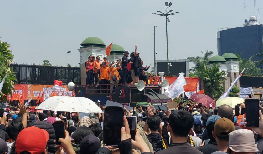 Mereka melakukan aksi demontrasi, menolak pengesahan Rancangan Undang-undang Pemilihan Kepala Daerah (RUU Pilkada), yang terjadwal di dalam Rapat Paripurna hari ini.