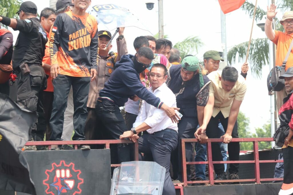 Perwakilan demonstran secara bergantian naik ke atas mobil komando untuk menyampaikan orasi berisi kritik dan kecaman yang dialamatkan kepada Anggota DPR RI serta Joko Widodo Presiden.