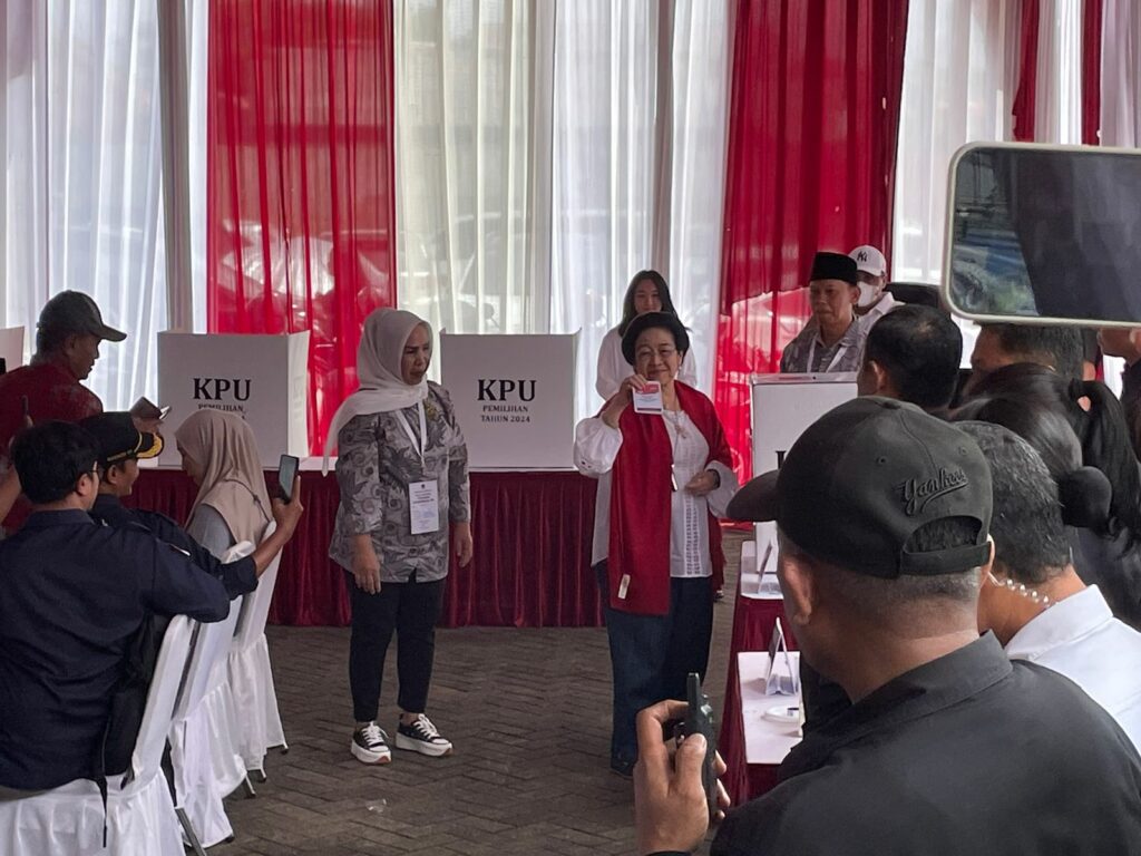 Tiba di lokasi, Megawati mengenakan pakaian berwarna putih serta selendang merah, mendatangi TPS 024 sekitar pukul 11.12 WIB.