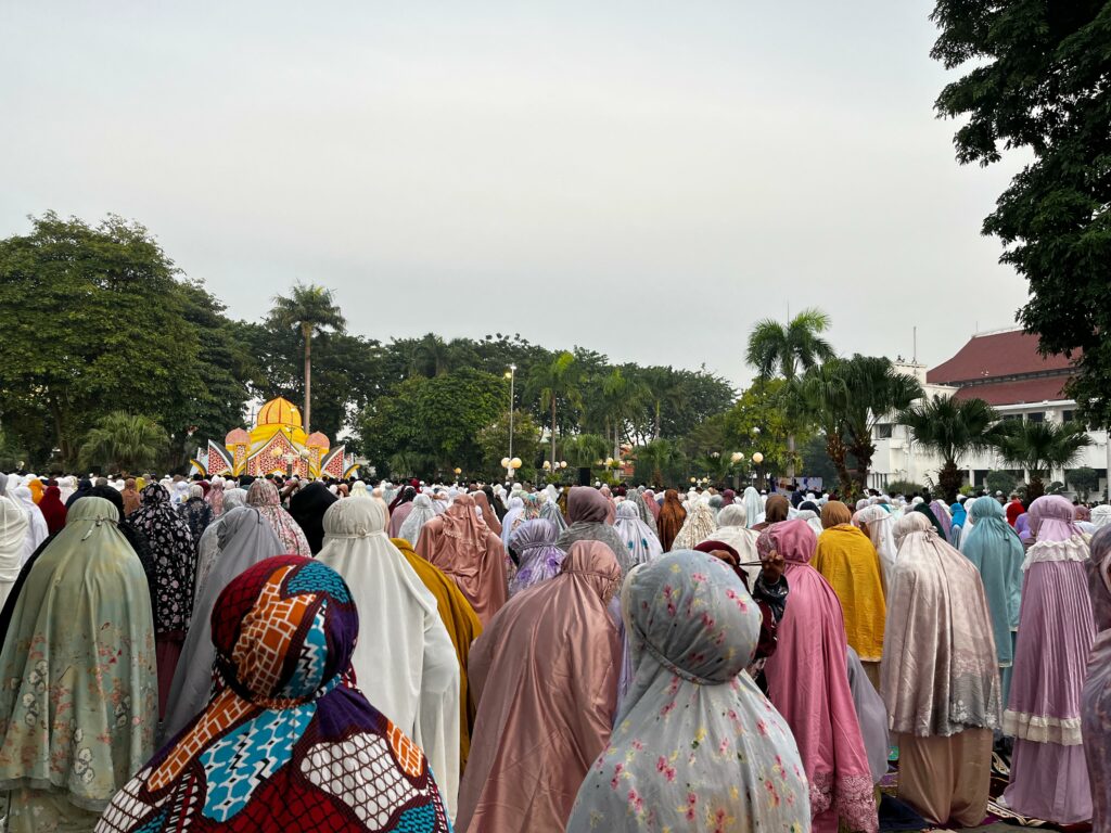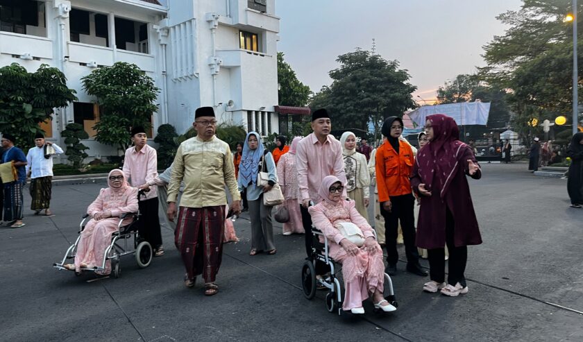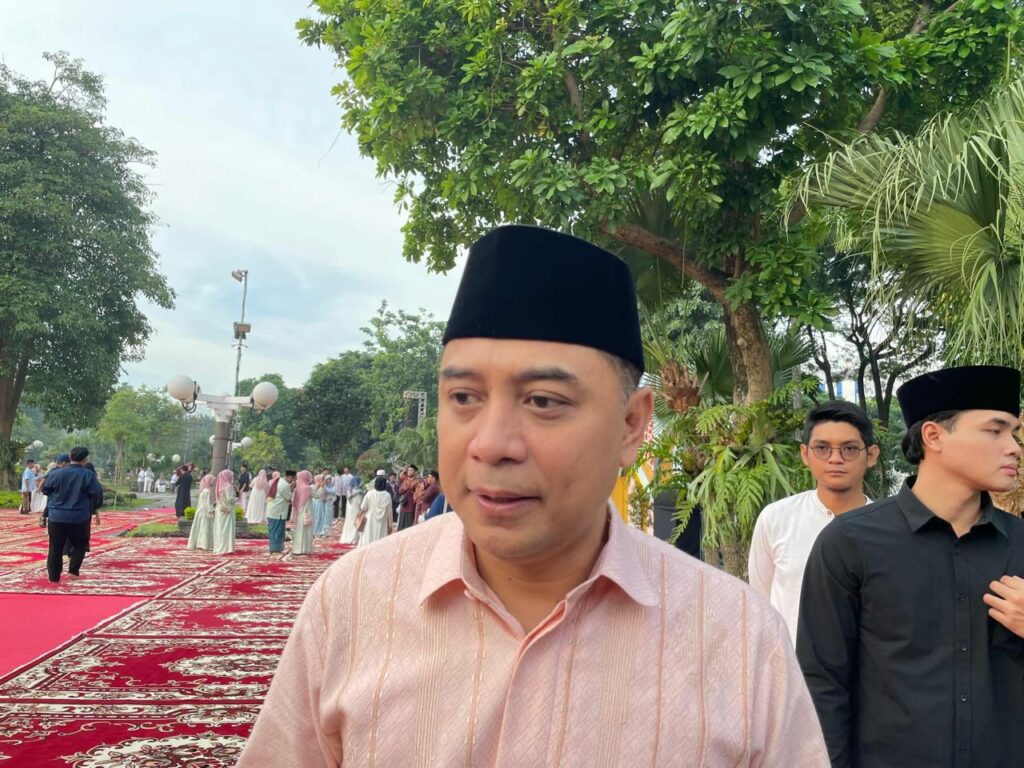 Ribuan jemaah menjalankan salat Idulfitri di Balai Kota Surabaya, Sabtu (21/3/2026) pagi. Termasuk di antaranya Eri Cahyadi Wali Kota Surabaya bersama keluarga.