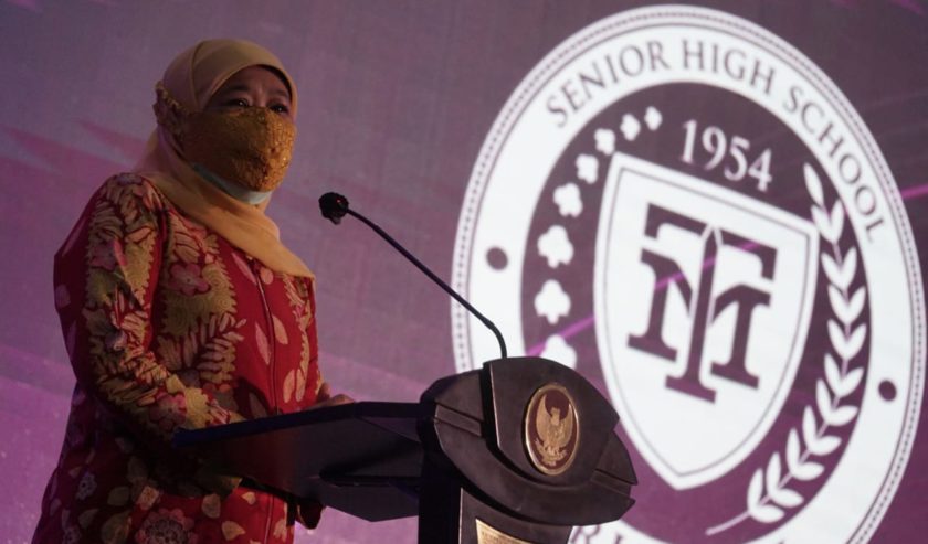 Khofifah Indar Parawansa Gubernur Jawa Timur, Kamis (26/11/2020) berikan sambutan pada rebranding SMA Trimurti Surabaya. Bekerjasama dengan Arizona State University, menyongsong peradaban baru, generasi Alpha membutuhkan program pembelajaran berbasis digital. “Namun demikian jangan dilupakan bahwa peningkatan kualitas SDM juga dibutuhkan. Ini penting agar pendidikan berlangsung tanpa hambatan,” ujar Khofifah. Trimurti Senior High Scholl diharapkan menjadi sekolah yang memiliki visi dan misi seiring perkembangan teknologi.(Foto: Totok suarasurabaya.net)
