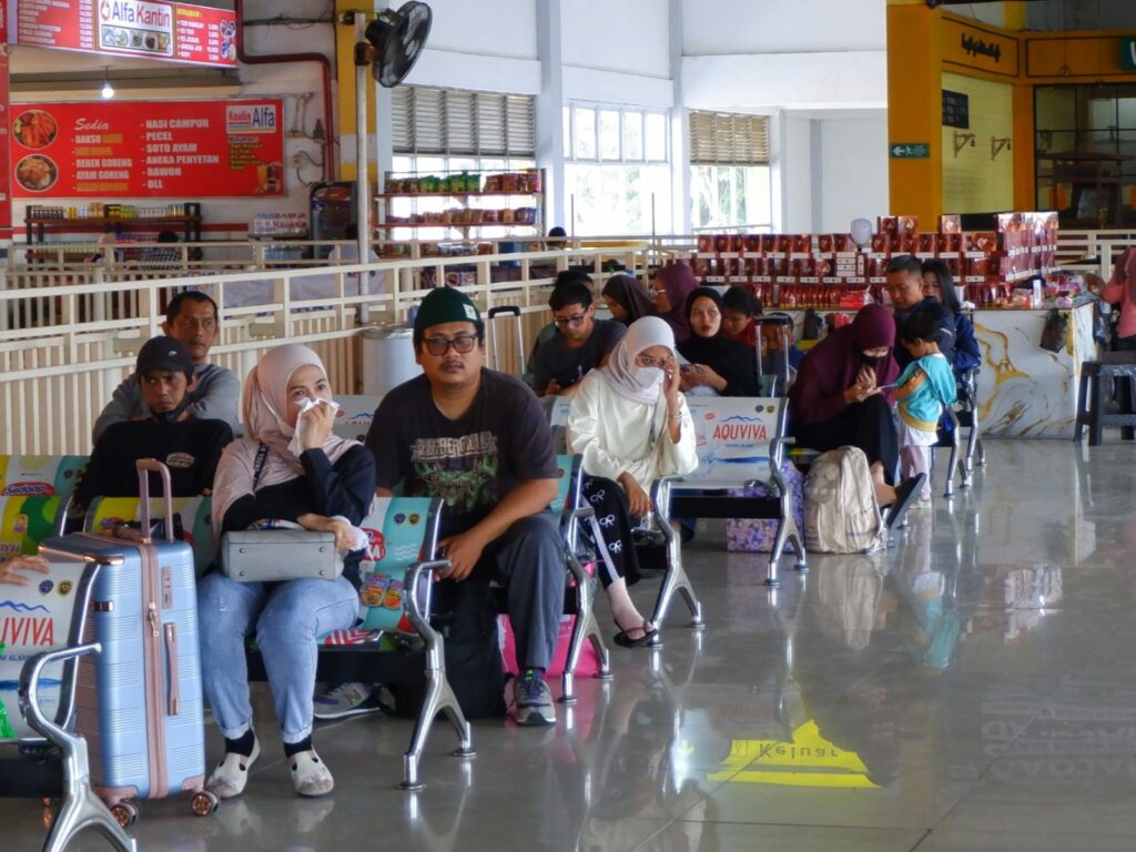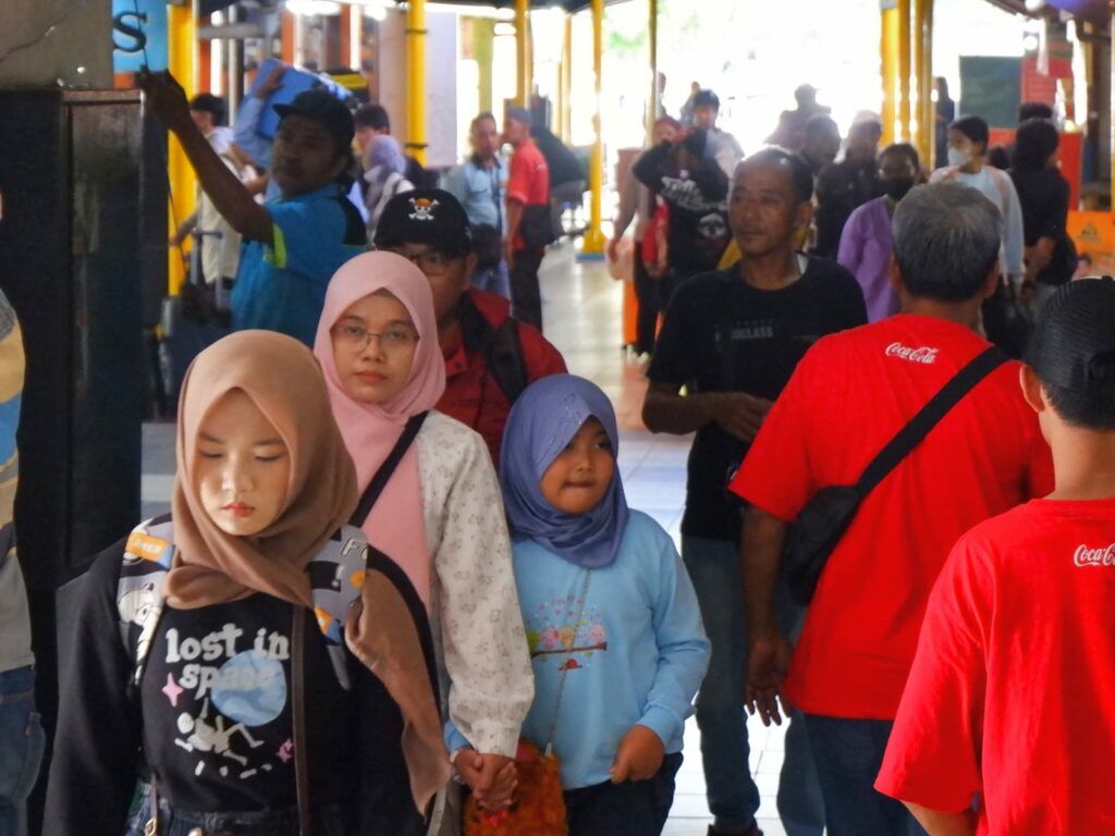 Kepadatan arus penumpang mulai terlihat di Terminal Purabaya atau Bungurasih menjelang Hari Raya Idulfitri 2026, Rabu (18/3/2026).