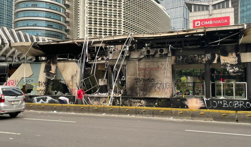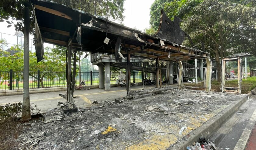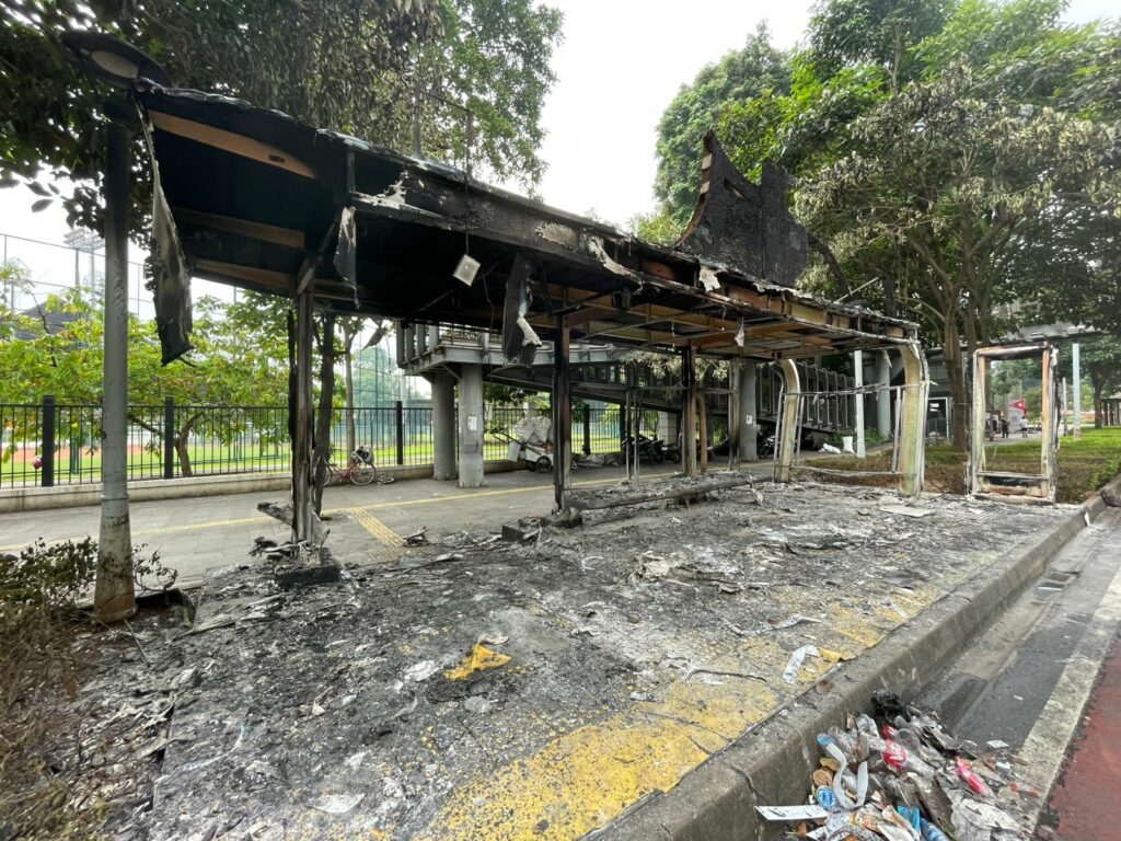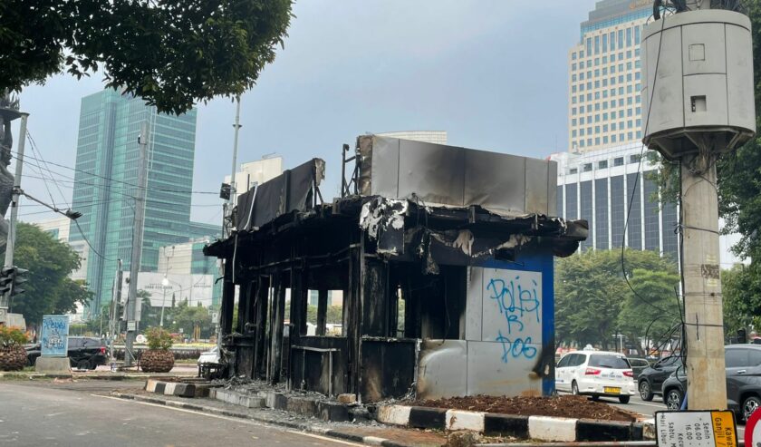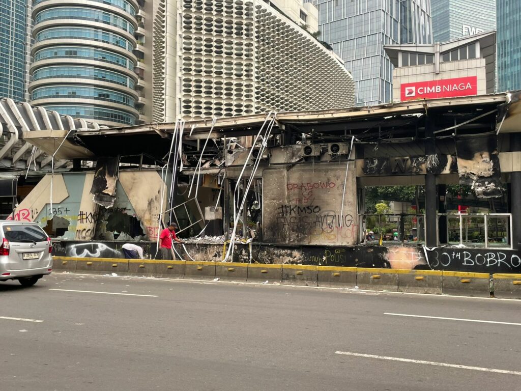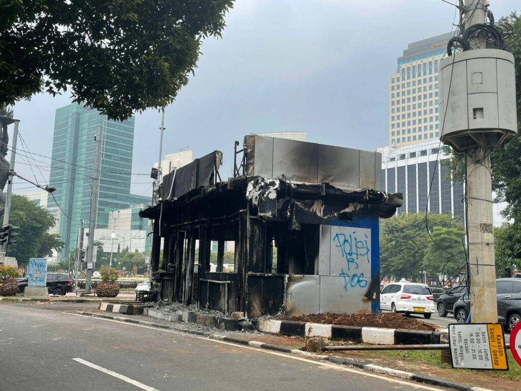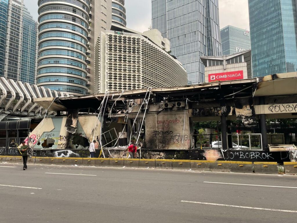 Sejumlah halte bus TransJakarta di Jalan Jenderal Sudirman, Jakarta, dibakar dan dirusak dalam aksi massa di Polda Metro Jaya yang terjadi pada Jumat (29/8/2025) malam.