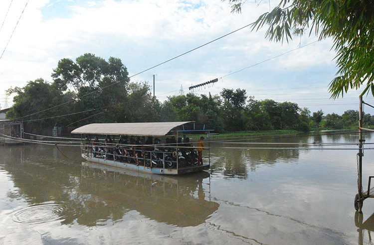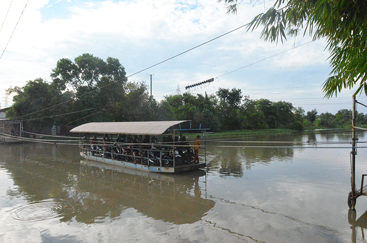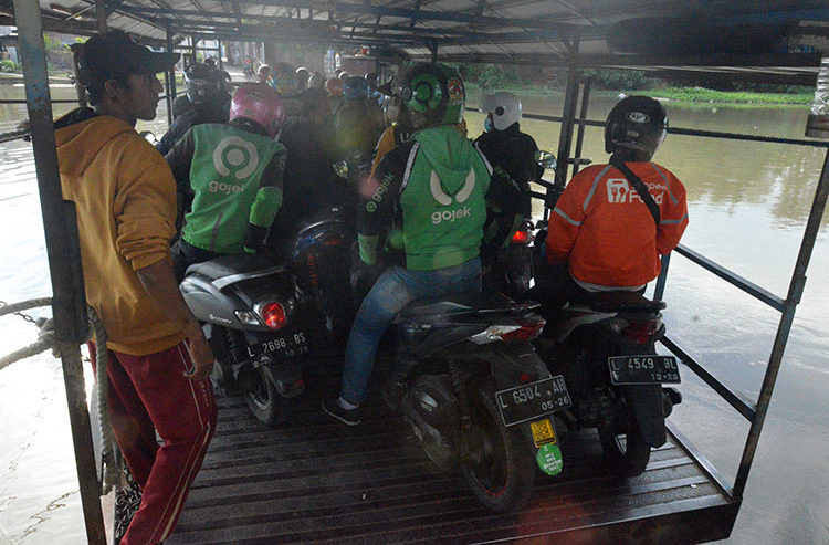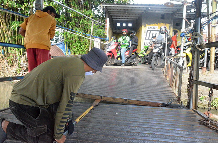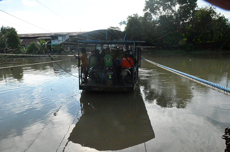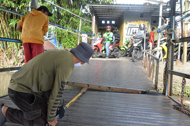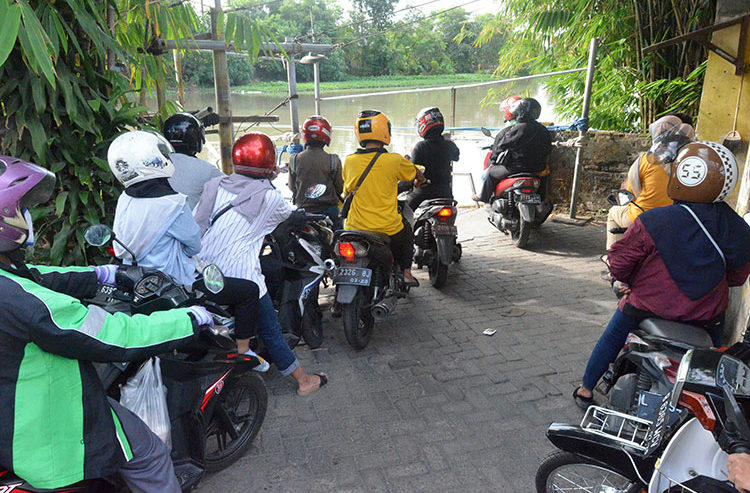 Sejumlah warga masyarakat memilih naik perahu tambangan di kawasan Simowau, Pagesangan menuju Kebraon dan sekitarnya, menghindari penyekatan yang digelar di kawasan Jl. Karangpilang. “Kalau masuk dari Karangpilang kemarin disekat. Makanya pilih naik tambangan saja. Murah, lebih cepat. Tidak disekat-sekat,” ujar Danang yang tinggal di Kebaron dan bekerja di kawasan Juanda, Jumat (9/7/2021). Selain menghindari penyekatan, pad ahari biasa jika terjadi kemacetan di kawasan Karangpilang, masyarakat memang lebih banyak menggunakan jasa perahu tambangan di kawasan Pagesangan ini. Menyeberangi Sungai Berantas, pengendara sepeda motor mempercepat perjalanan sekalian menghindari kemacetan. Foto: totok suarasurabaya.net