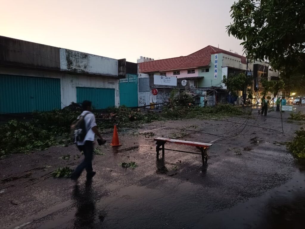 Hujan deras disertai angin kencang menyebabkan pohon tumbang dan tiang listrik patah di Jalan Kranggan, Bubutan, Surabaya pada Selasa (3/2/2026) sore.