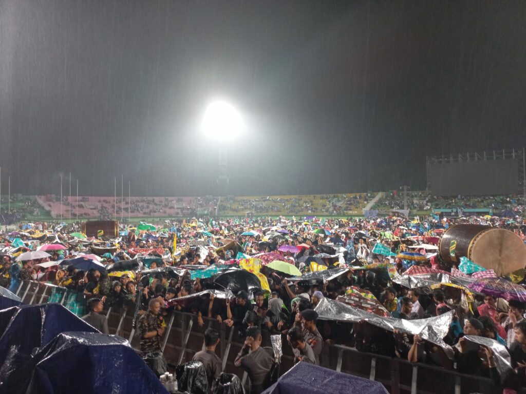Hujan deras turun menjelang pagelaran seni dan budaya Semarak Satu Abad Nahdlatul Ulama di dalam Stadion Gelora Delta Sidoarjo, Selasa (7/2/2023).