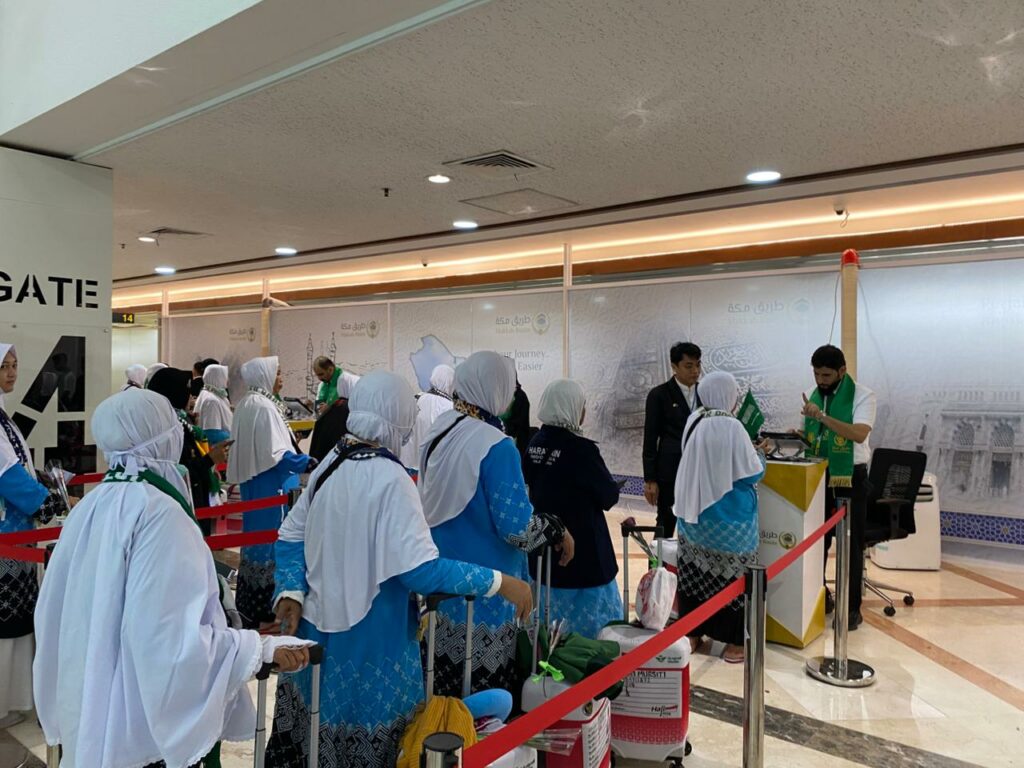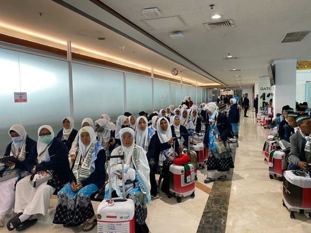 Setibanya di Bandara Juanda, para jemaah berkumpul di ruang tunggu khusus. Di salah satu sudut, para jemaah perempuan dengan balutan kerudung putih biru duduk berderet. Sebagian terlihat berbincang pelan, sementara lainnya memilih beristirahat sambil memegang dokumen perjalanan.