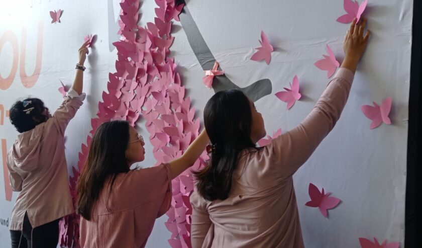 Mahasiswa Fakultas Psikologi dan Badan Eksekutif Mahasiswa (BEM) Universitas Surabaya (Ubaya) membuat ratusan karya seni kupu-kupu kertas untuk memperingati bulan kesadaran kanker payudara (breast cancer awareness month) di Ubaya, Rabu (18/10/2023).