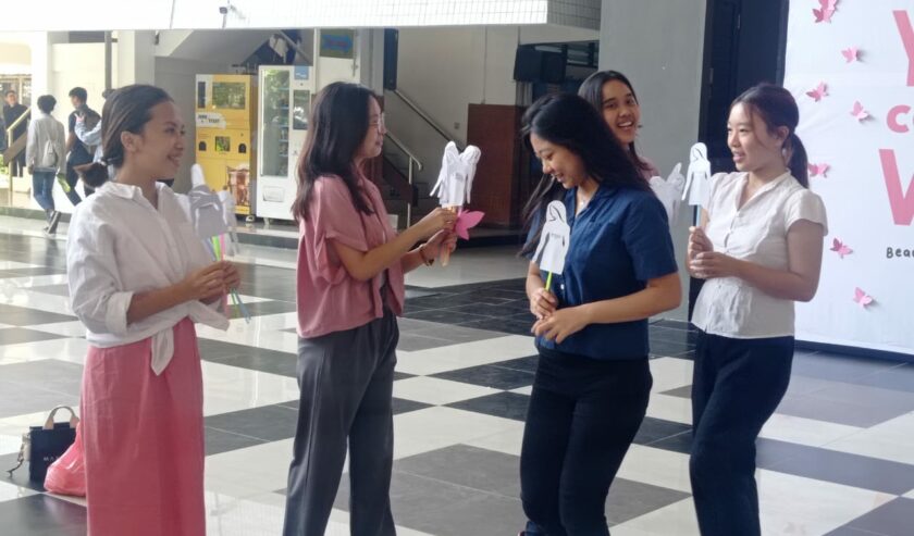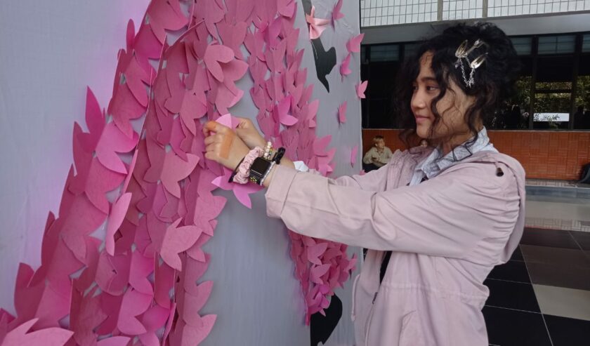 Mahasiswa Fakultas Psikologi dan Badan Eksekutif Mahasiswa (BEM) Universitas Surabaya (Ubaya) membuat ratusan karya seni kupu-kupu kertas untuk memperingati bulan kesadaran kanker payudara (breast cancer awareness month) di Ubaya, Rabu (18/10/2023).