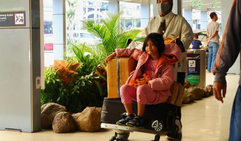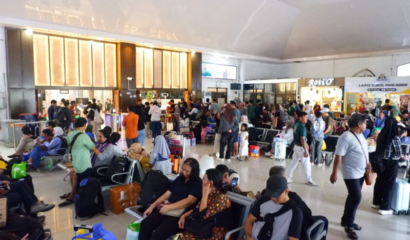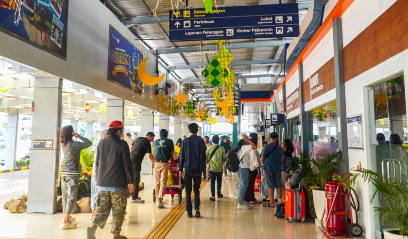 Sejumlah penumpang tampak memadati area keberangkatan dan ruang tunggu pada hari Minggu (15/3/2026).